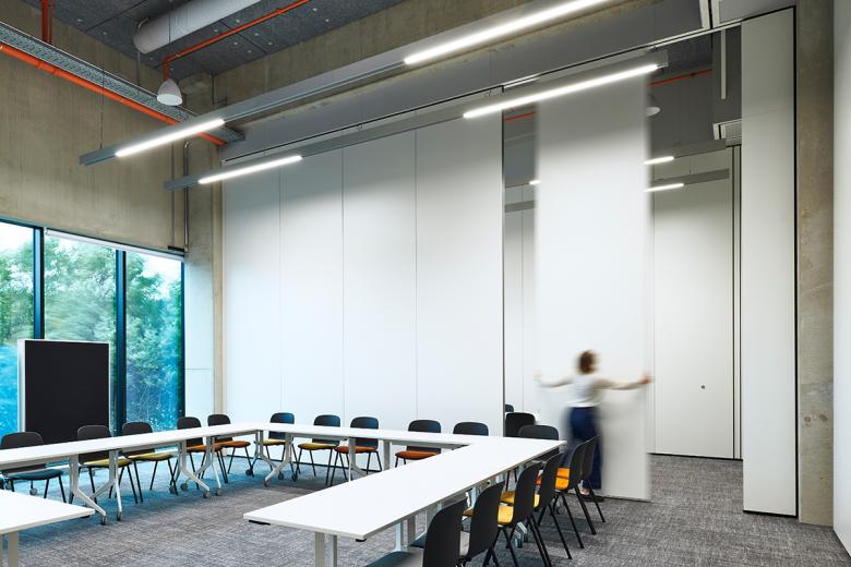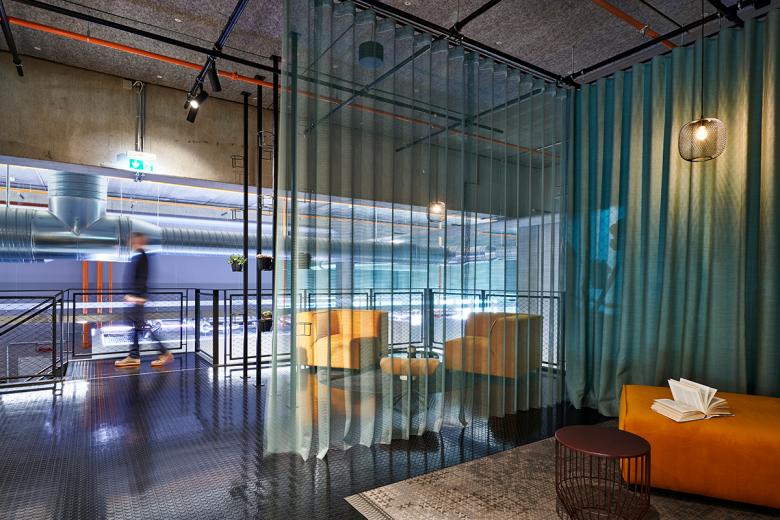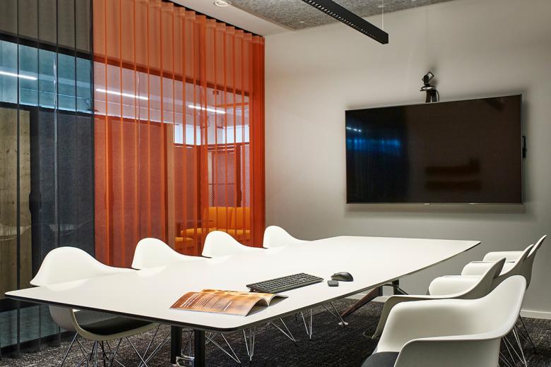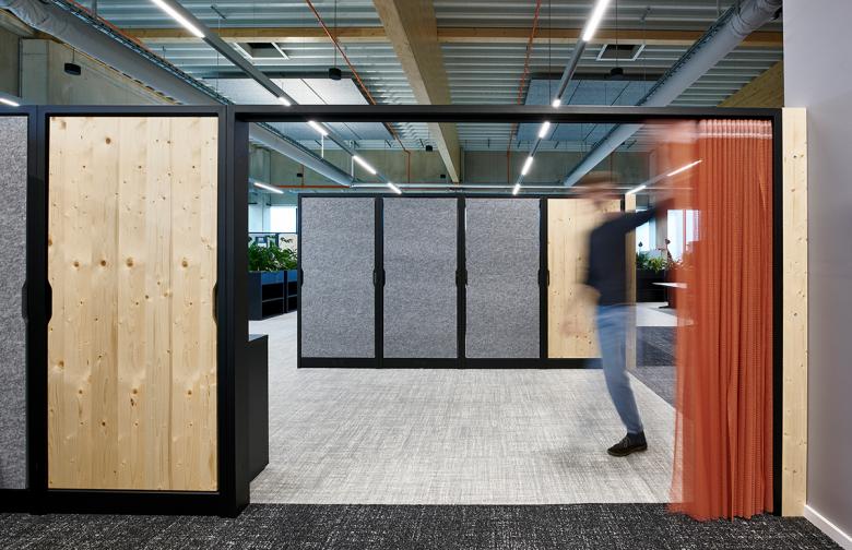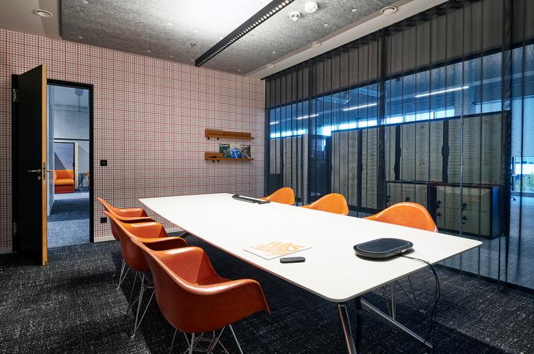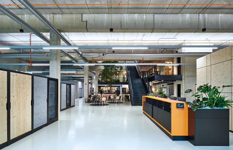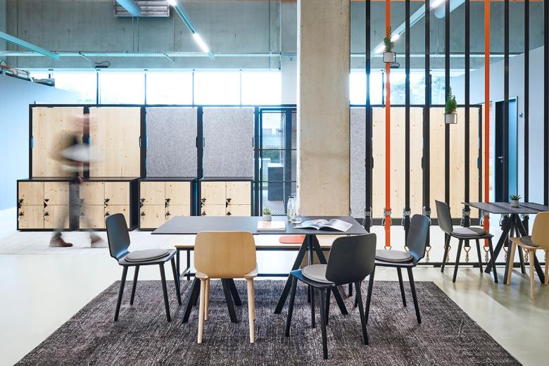 In den von RKW Architektur + entwickelten Bürogebäuden wurde auf geschlossene Räume weitgehend verzichtet. Deckenhöhen von 6,40 Metern und sichtbare Installationen betonen noch die Offenheit der zweigeschossigen Neubauten. Größtmögliche Flexibilität und Offenheit spielen auch bei den Büroflächen eine zentrale Rolle. Sie sind für agiles Arbeiten geplant und verfügen über fast keine festen Einbauten. Um trotzdem die Gliederung einzelner Bereiche zu ermöglichen, konzipierte brandherm + krumrey ein intelligentes Systemmöbel. Das multifunktionale Stahl-Raster besteht aus einzelnen Feldern, die als flexible Raumteiler fungieren. Dank ihrer geringen Höhe bleibt der offene Gesamtcharakter der hallenartigen Innenräume erhalten. Mit Hilfe der Systemelemente lassen sich variable Bereiche konfigurieren und hybride Projekträume bilden. Dort, wo Meetings in größerer Runde stattfinden, bieten außerdem raumhohe, verschiebbare Trennwände variable Möglichkeiten der Belegung und Nutzung.
