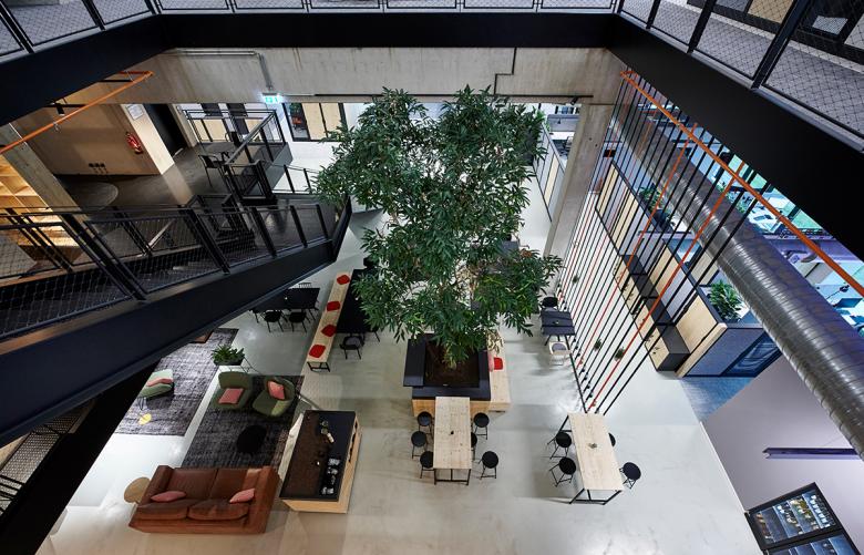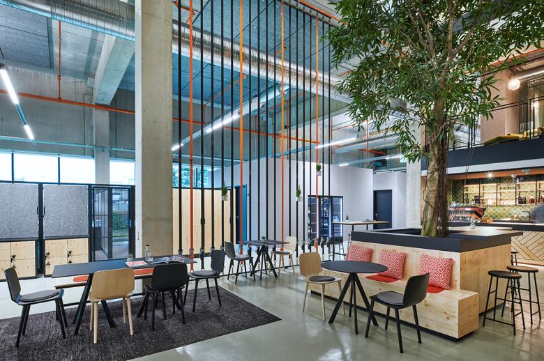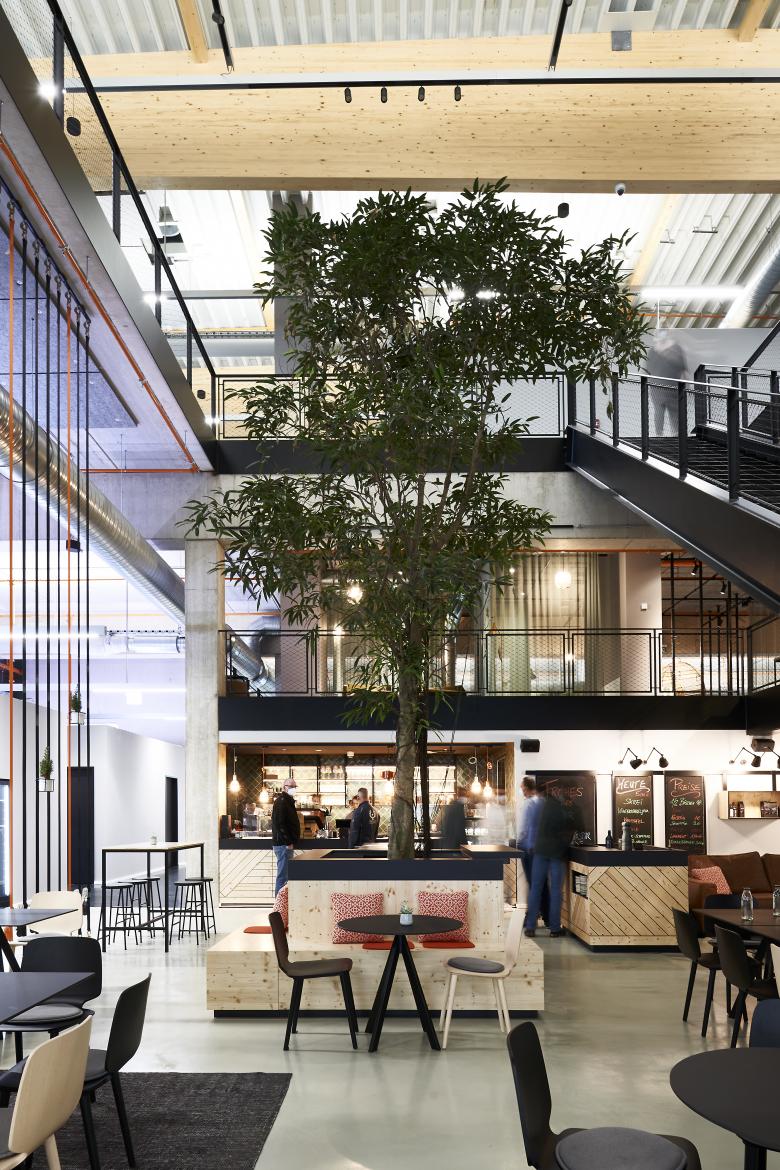 Das soziale Herzstück der Gebäude ist der zentrale „Deli“ im Erdgeschoss, in dem leichte Mahlzeiten frisch zubereitet werden. Locker gruppierte Tische und Polstermöbel laden Mitarbeiter und Mitarbeiterinnen zur gemeinsamen Nutzung ein. Teppiche und viele Grünpflanzen sorgen für eine angenehme Atmosphäre. Hingucker ist jeweils der sechs Meter hohe Baum im Zentrum der Neubauten, der zum guten Büroklima beiträgt. Als ein augenzwinkernder Verweis auf die Profession der LIST Gruppe wurden Materialien aus der Baubranche verwendet. Angelehnt an das Corporate Design ist auch die wiederkehrende Verwendung des Orangetons aus dem Logo des Bauherrn. Im eher gedeckten Farbumfeld der neuen Arbeitswelt setzen Möbel, Einbauten und Accessoires in leuchtendem Orange immer wieder farbige Akzente. Wie weit der Systemgedanke bei den Neubauten reicht, zeigt sich im baulichen Gesamtkonzept: Die Gebäude lassen sich bei Bedarf über die Achsen erweitern, damit auch hier dank vorgefertigter Bauweise eine schnelle Anpassung möglich ist. Im Zusammenspiel von offener Architektur und Raumplanung entstanden so äußerst variable Arbeitswelten für die aufstrebende Unternehmensgruppe.