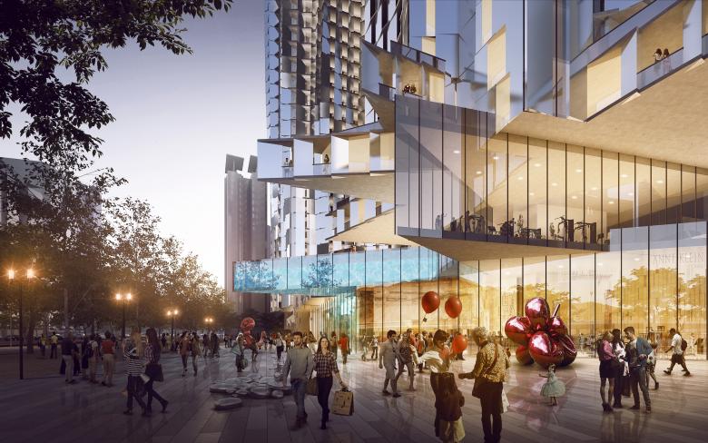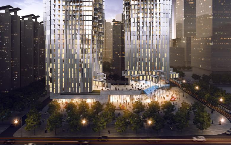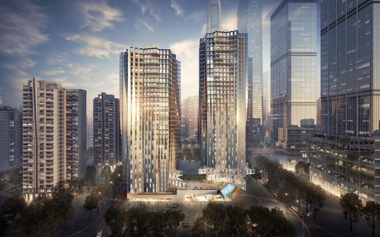The 122 meter (430 foot) tall, 582-unit, 32 story concrete tower is located in the central business district of Shenzhen. Drawing inspiration from the peony flower, a traditional floral symbol for China, this scheme’s pair of irregular and organic housing towers appear to bloom from their surroundings. As its pleated form twists and angles into shape, these towers create the impression not of a static object but instead an organic one that is alive and moving. The building is reduced down to elements of columns and windows, of solid and void, mass and space. The pleated form of the twin towers allows for maximum daylight and views into the residences while the matt finished stainless façade panels will give the building a tectonic and physical presence. 该方案的灵感来自牡丹花,牡丹花是中国传统的花卉象征,它的褶裥形式扭曲形成独特的姿态。该方案尝试创造类似的非静态物体的印象,形成一个有机的,活的和变化的形态