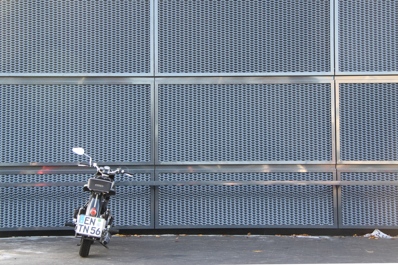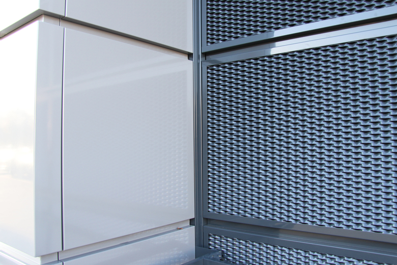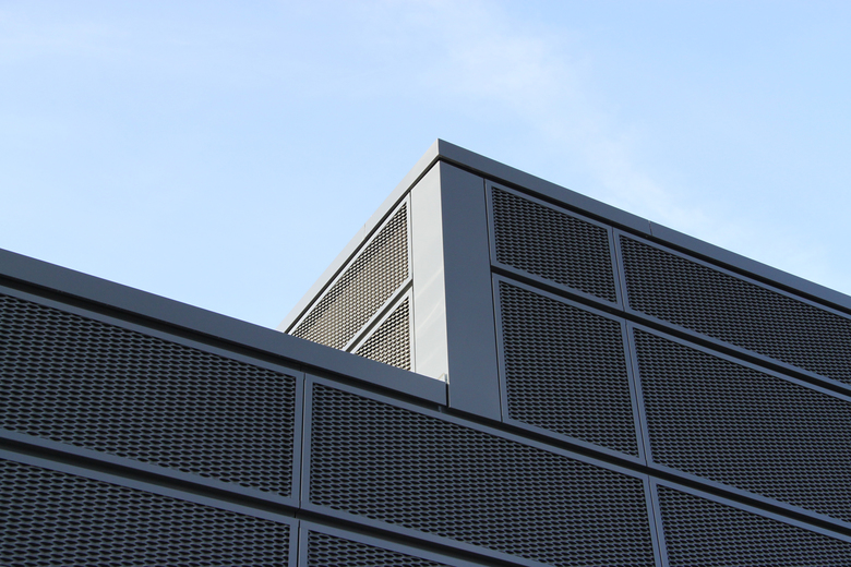 Neben diesen Maßnahmen wurden vor allem die Dächer und die Fassade energetisch saniert. Das edle Dunkelgrau der Streckmetallfassade bildet nun die Kulissen für die einzelnen Marken.