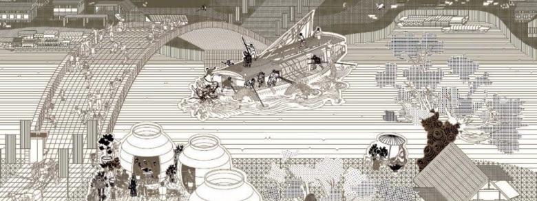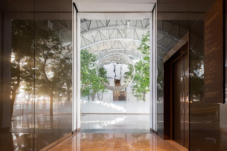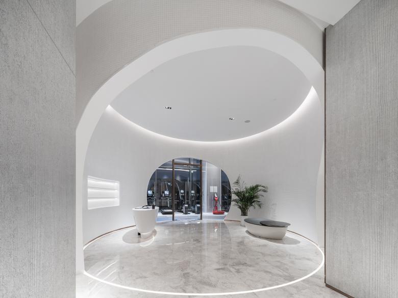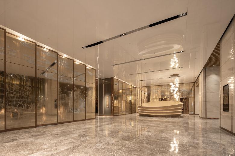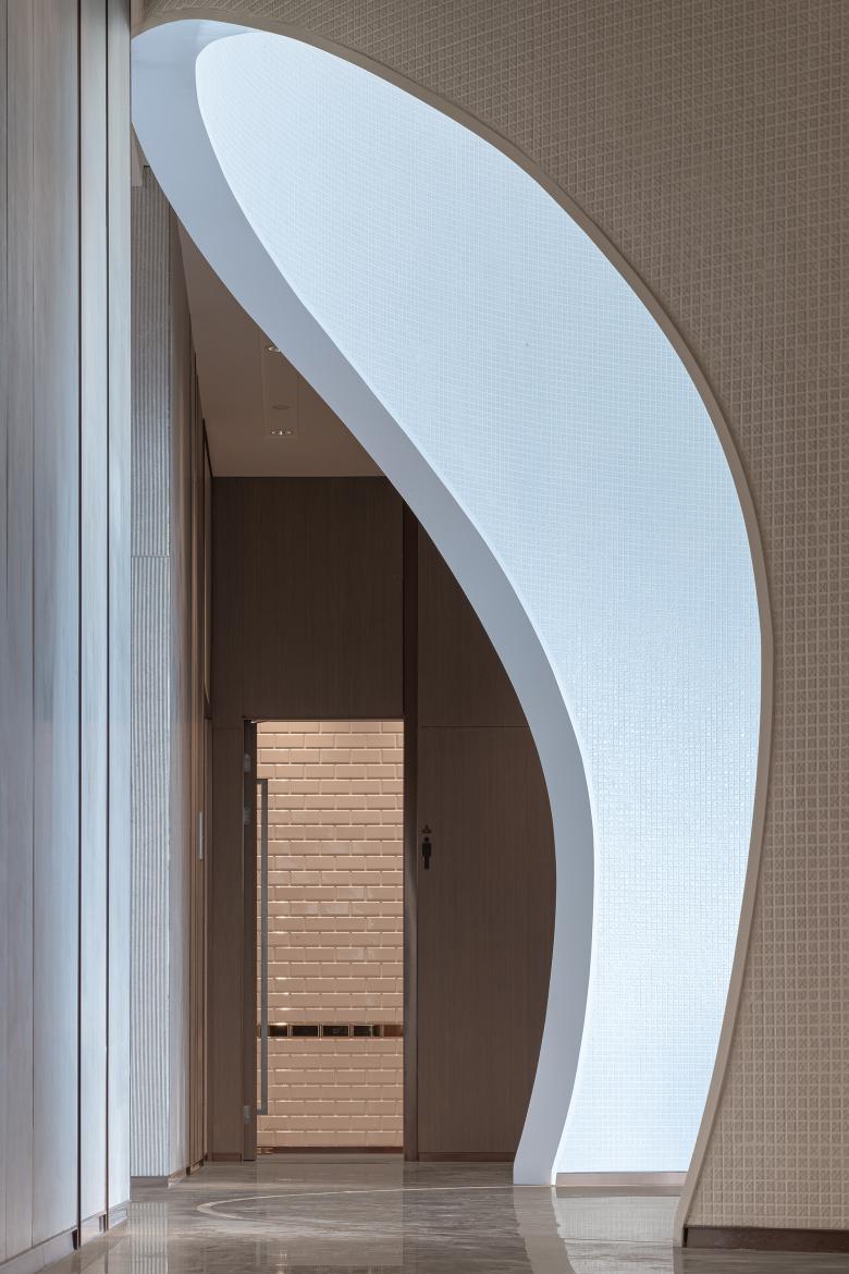 The shape of a sailing vessel is employed in the reception area which is equipped with arc-shaped lighting devices. The shape design echoes the water reflection during sailing in the river. Under the natural light, the inside and outside scenery forms a connection.