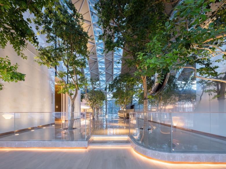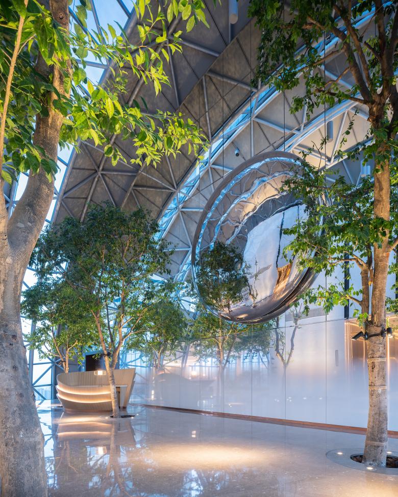 Under the towering arc-shaped dome, green plants grow freely upwards in an array, combined with the round wooden seats under the tree, highlighting the lounge's cozy style.