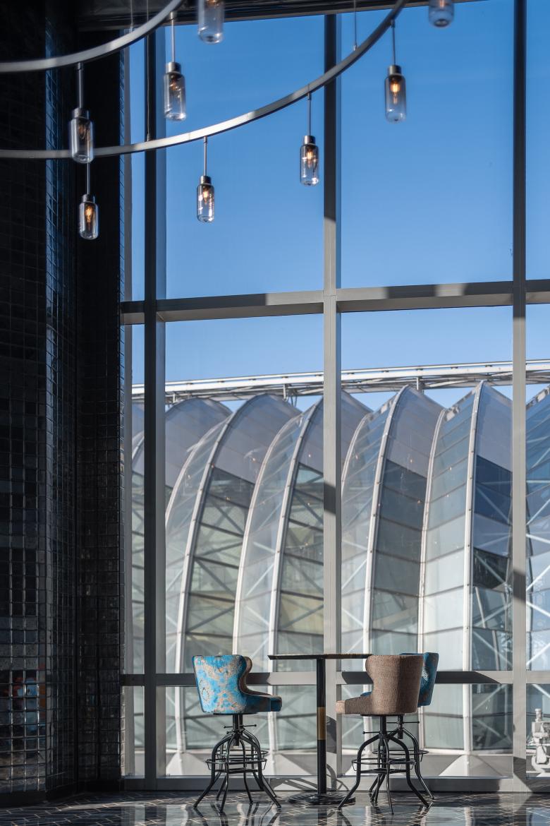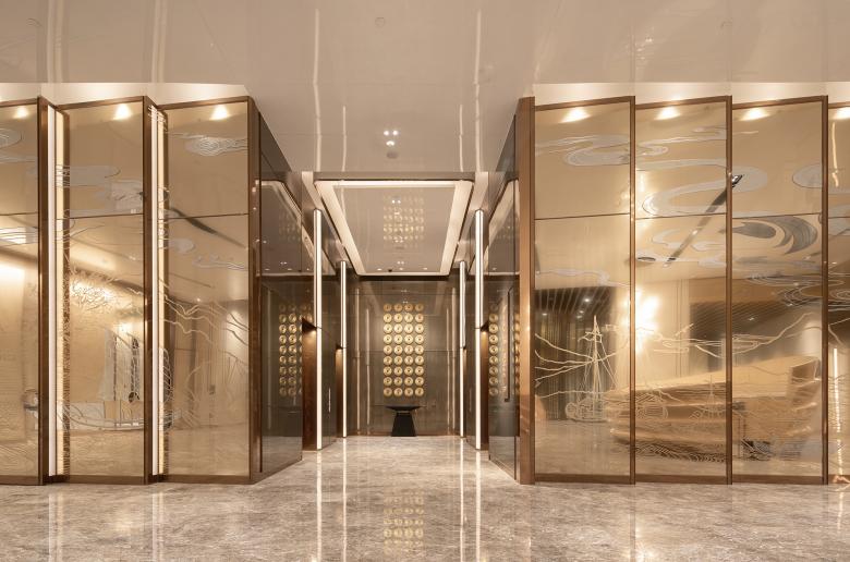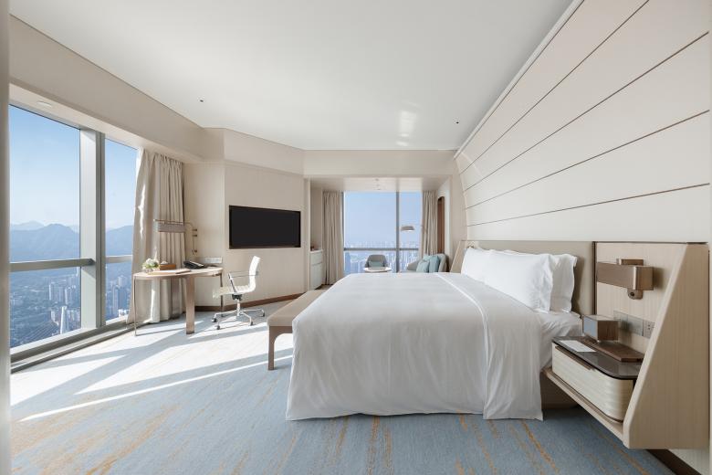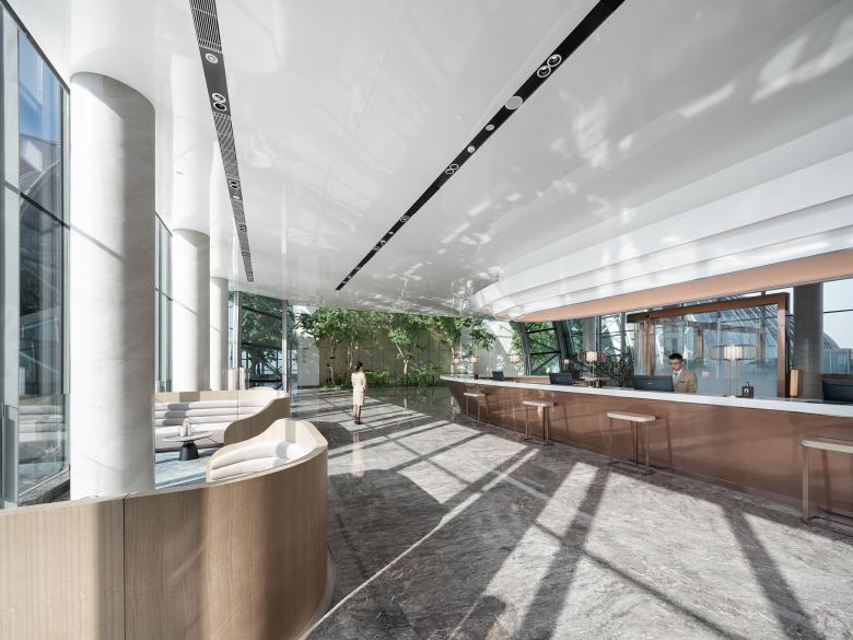 The hotel has its grand reception at the crystal sky bridge on level 42, which is also where the lounge and specialty restaurant “Jing” are located. The hotel has 380 custom designed guestrooms and suites above the 250-m-high sky bridge. A contemporary concept for the hotel interior compliments the iconic architecture by extending the sail metaphor inside. Based on the nautical aesthetics, the streamline features are interwoven with touches of Chinese motifs and crafts, moving and flowing from the ground entrance to the crystal sky bridge.