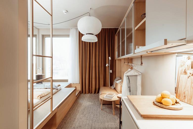 Die bestehende Architektur der alten Hotelzimmer konnte aus Kostengründen nicht gross verändert werden. Hier spielte die Höhe der Zimmer eine wesentliche Rolle. Um die Wohnungen trotzdem geräumig und komfortabel zu gestalten, wurden die Stauraummöglichkeiten eben nicht nur klassisch an den Wänden geplant. Die neu erstellten Podeste sind durchdacht und bieten viel Stauraum. Dadurch entsteht viel Platz zum Sein und sich wohlfühlen. Die Wohnung bietet dem Nutzer einen Ort, welcher er auf die jeweiligen Bedürfnisse selbst mitgestalten kann.