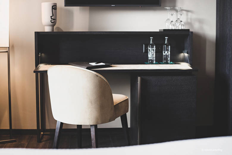 Alle renovierten Gästezimmer im 5. Obergeschoss sind von Grund auf neu gestaltet - individuell, stilvoll mit viel Charme. Das elegant dunkel gehaltene Interior mit weichen farbigen Akzenten ist schlicht und modern gehalten ohne dass den Gästen der Komfort genommen wird.