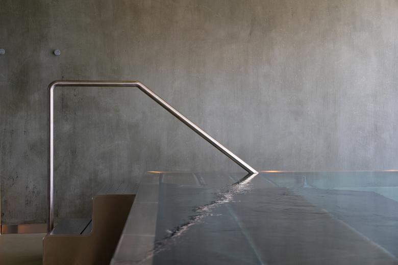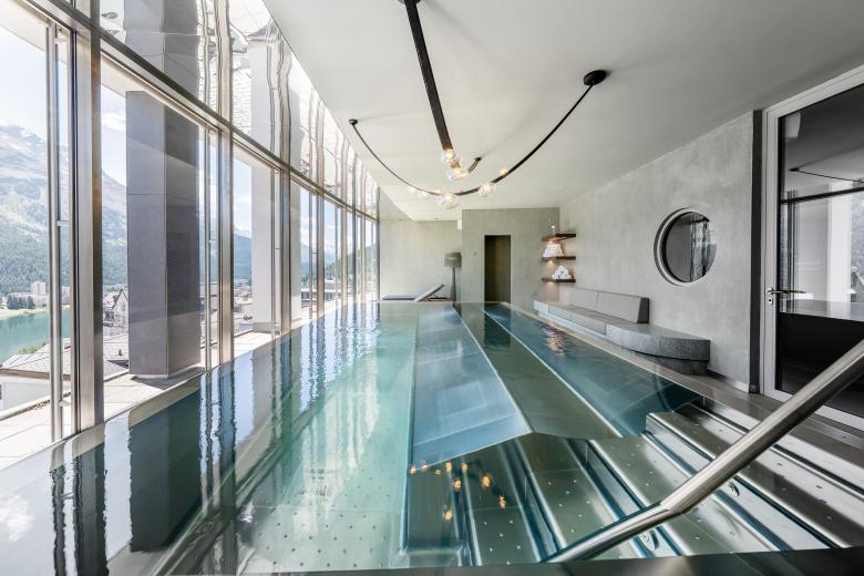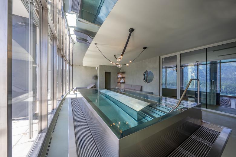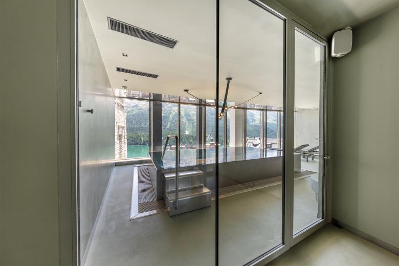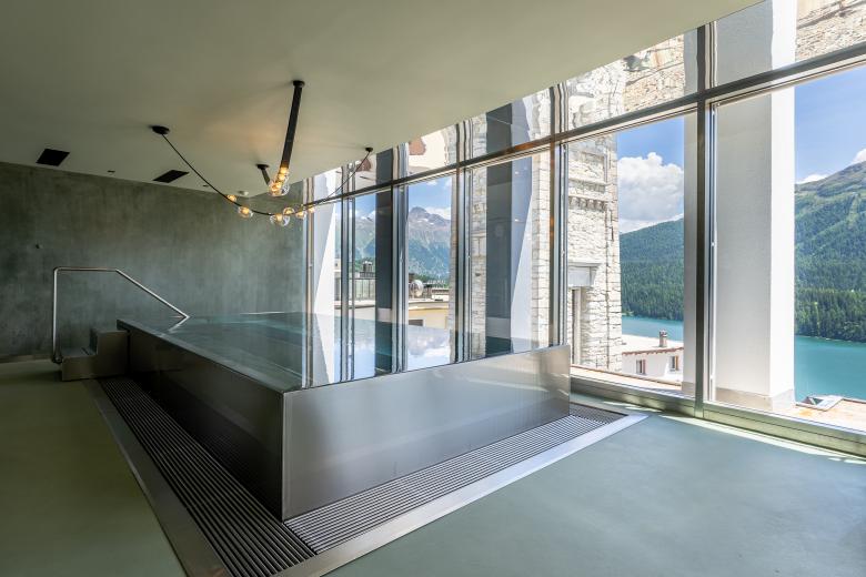 Der wahre Star ist das Panorama. Eine raumhohe Glasfassade rahmt die verschneiten Gipfel des Engadins wie ein lebendiges Kunstwerk. Das Zentrum bildet eine maßgefertigte Edelstahlwanne mit Infiniti-Rand, ausgestattet mit modernster Technik und dezent integrierten Funktionen für ein individuell erlebbares Spa auf höchstem Niveau.