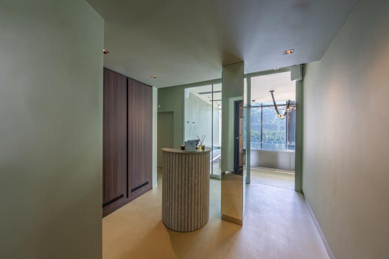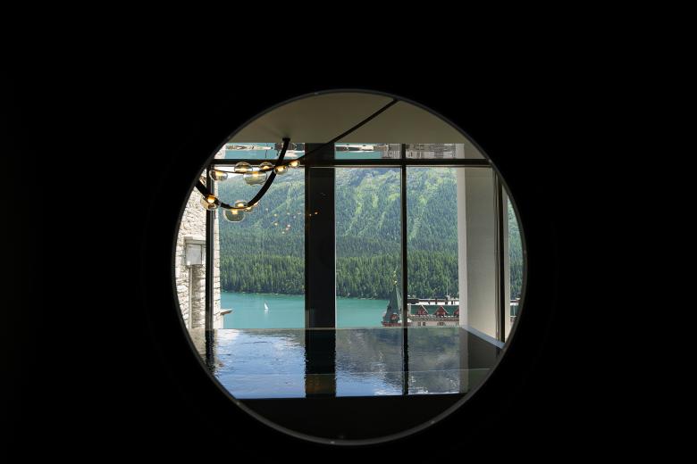 Umgeben ist das Becken von fugenlosem, grün schimmerndem Steinkalk aus seltenem Spluga Verde – eine Oberfläche von zeitloser Eleganz, die Ruhe ausstrahlt und Wärme spürbar macht. Ein Spiegel an der Decke schafft einen unerwarteten Moment der Poesie: Wer im Wasser liegt, sieht die Dächer von St. Moritz über sich auftauchen – die Aussenwelt wird Teil des Raumes.