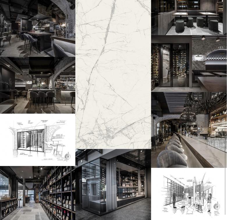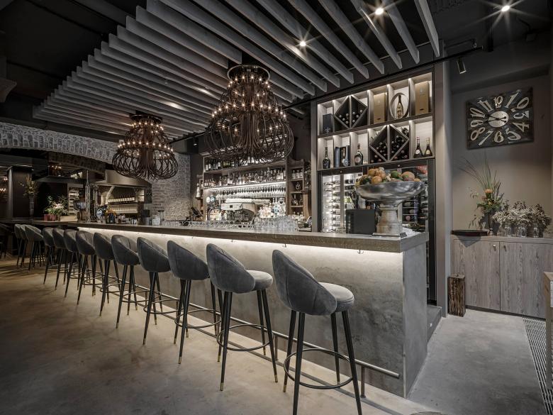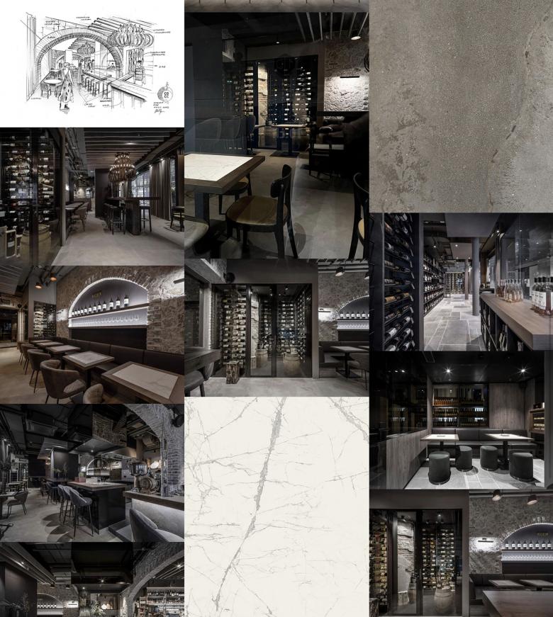 Rustikale und moderne Elemente zusammenverpackt in einer erdigen Farbkulisse erzeugen ein mediterranes Flair. Das Thema Wein sollte dabei im Vordergrund stehen. Die neuen künstlichen Steinbögen sollten zum einen die Assoziation eines Weinkellergewölbe suggerieren und zum anderen konnte man diese architektonischen Elemente als Zonierung des länglichen Grundrisses benutzen. Zudem konnte man dadurch auch die Geschichte der St. Galler Stadtmauern aufnehmen, welche in der oberen Altstadt überall ersichtlich sind. Insgesamt sollte eine neue Form eines Weinkellers/Taverne entstehen. Die Weinbar und der Weinladen sind durch die unterschiedlichen Bodenflächen unscheinbar voneinander getrennt. Im Weinladen arbeiteten wir mit einem charaktervollen Natursteinfliese. Während in der Bar der Bestandesboden einem Refresh unterzogen und möglichst roh belassen wurde. Zum anderen wurde die Trennung durch eine Schleuse in Form einer künstlichen Steinwand mit integrierten Weinregal erzielt.