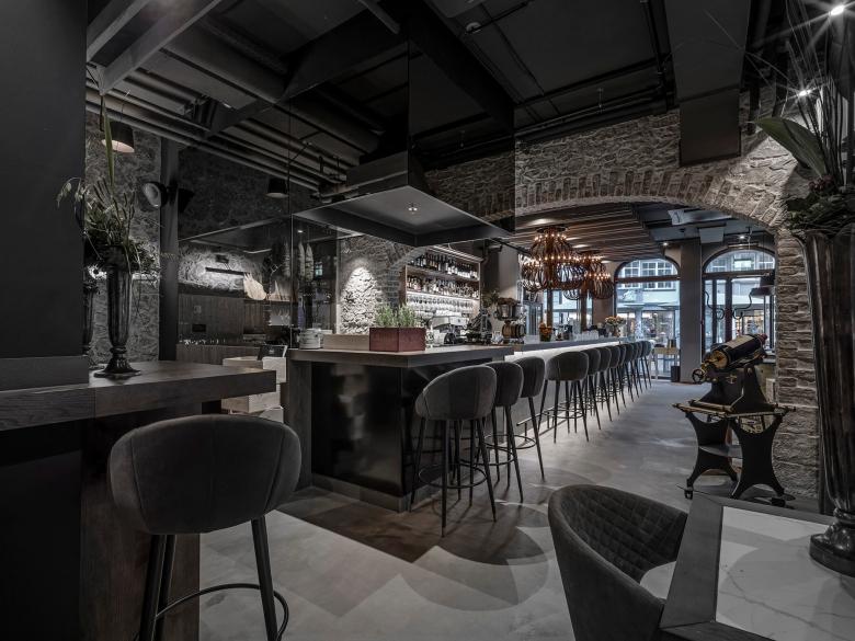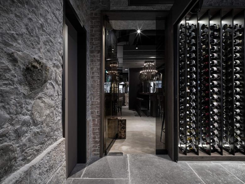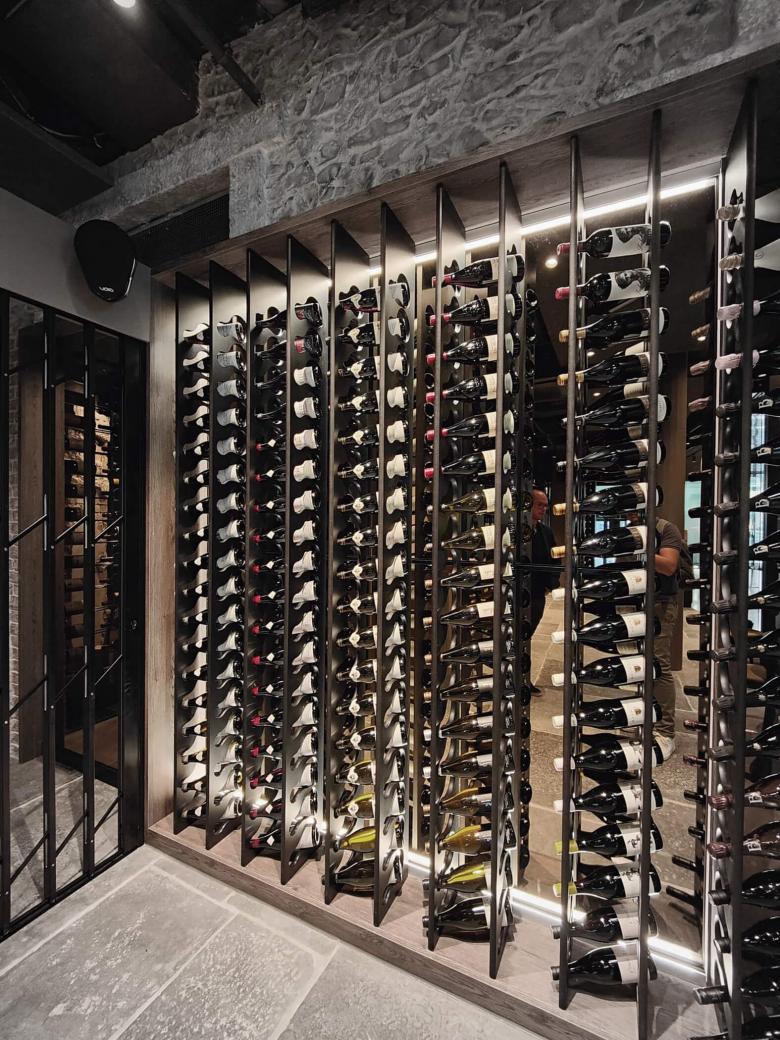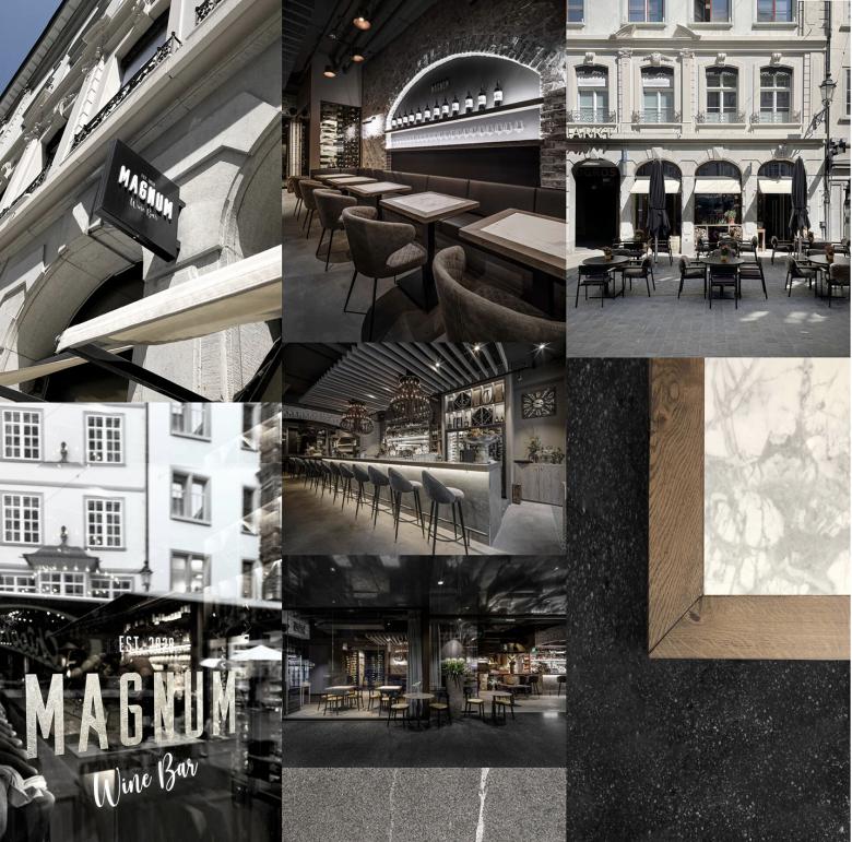 Im begehbaren Weinkeller wurde ein Teil der bestehenden Wände bewusst gezeigt und aufgefrischt. Der Raum wurde auch hier durch Einsatz von Spiegeln optisch vergrössert und erzeugt beim Betrachter eine positive Spannung aus. Zusammen mit den neuen Elementen bildet der Weinkeller eine stimmige Einheit. Des weiteren wurden diverse Lose Möbel und Leuchten kreiert. Wie beispielsweise die drei grossen Highlight Leuchten oberhalb der Bar oder die Tische mit Feinsteinzeugfüllungen sind Unikate und wurden speziell für das MAGNUM designt.