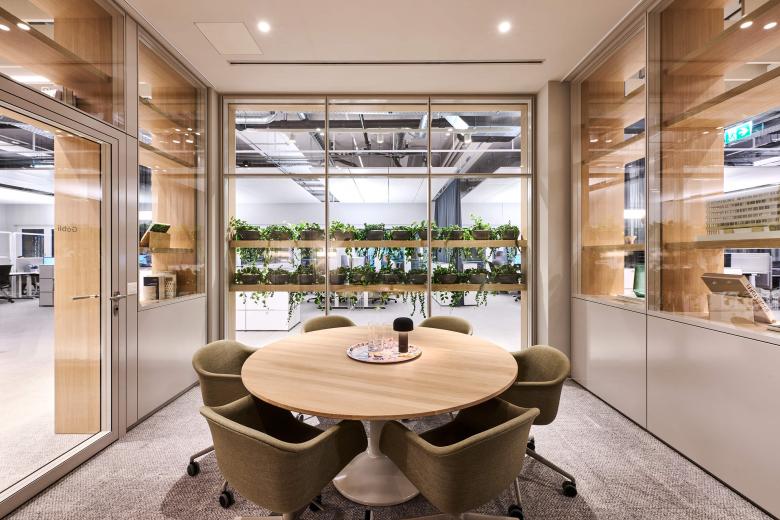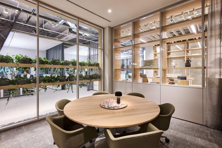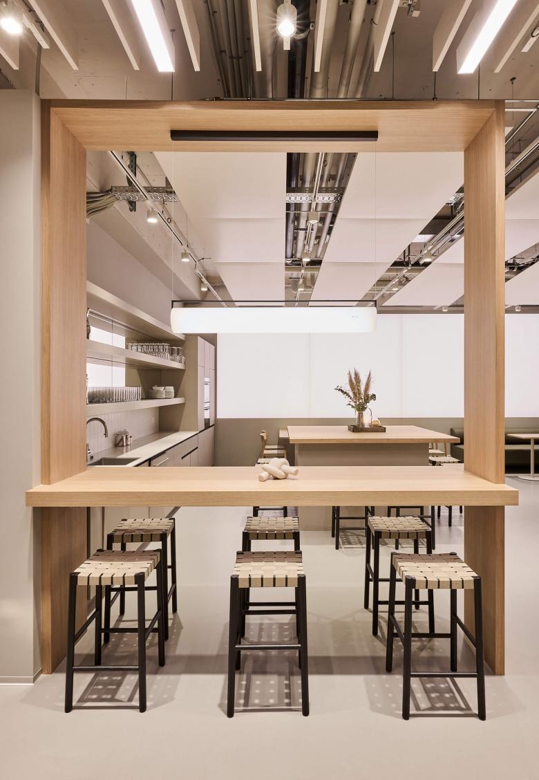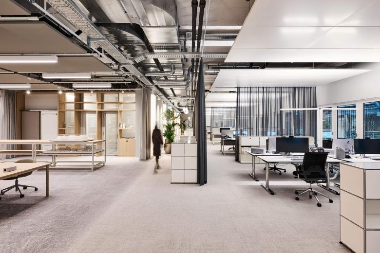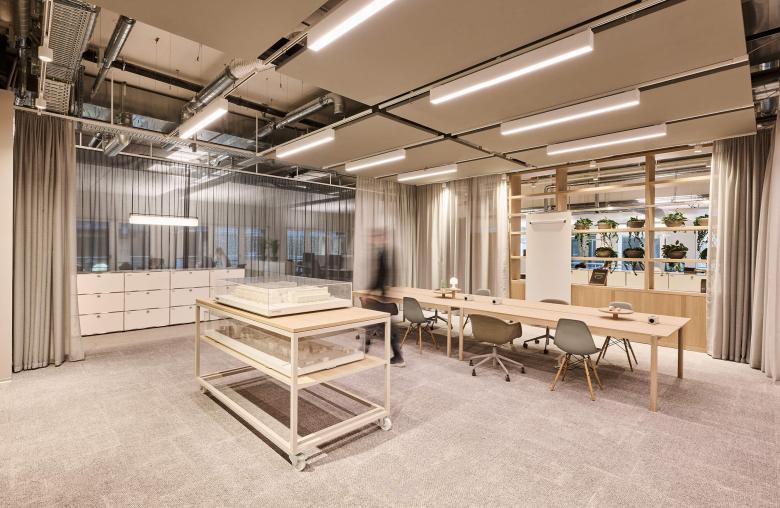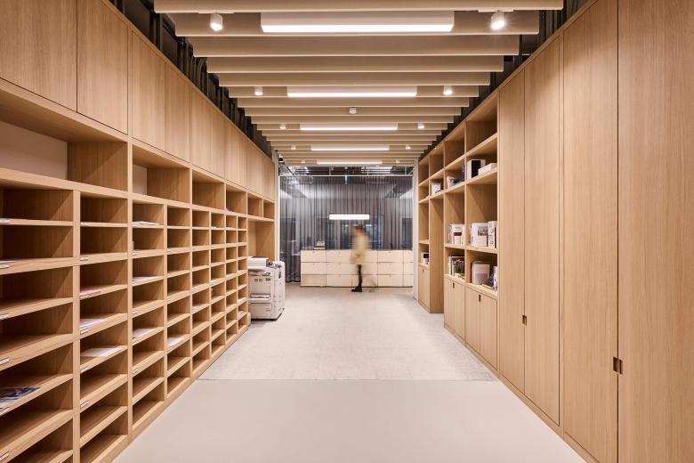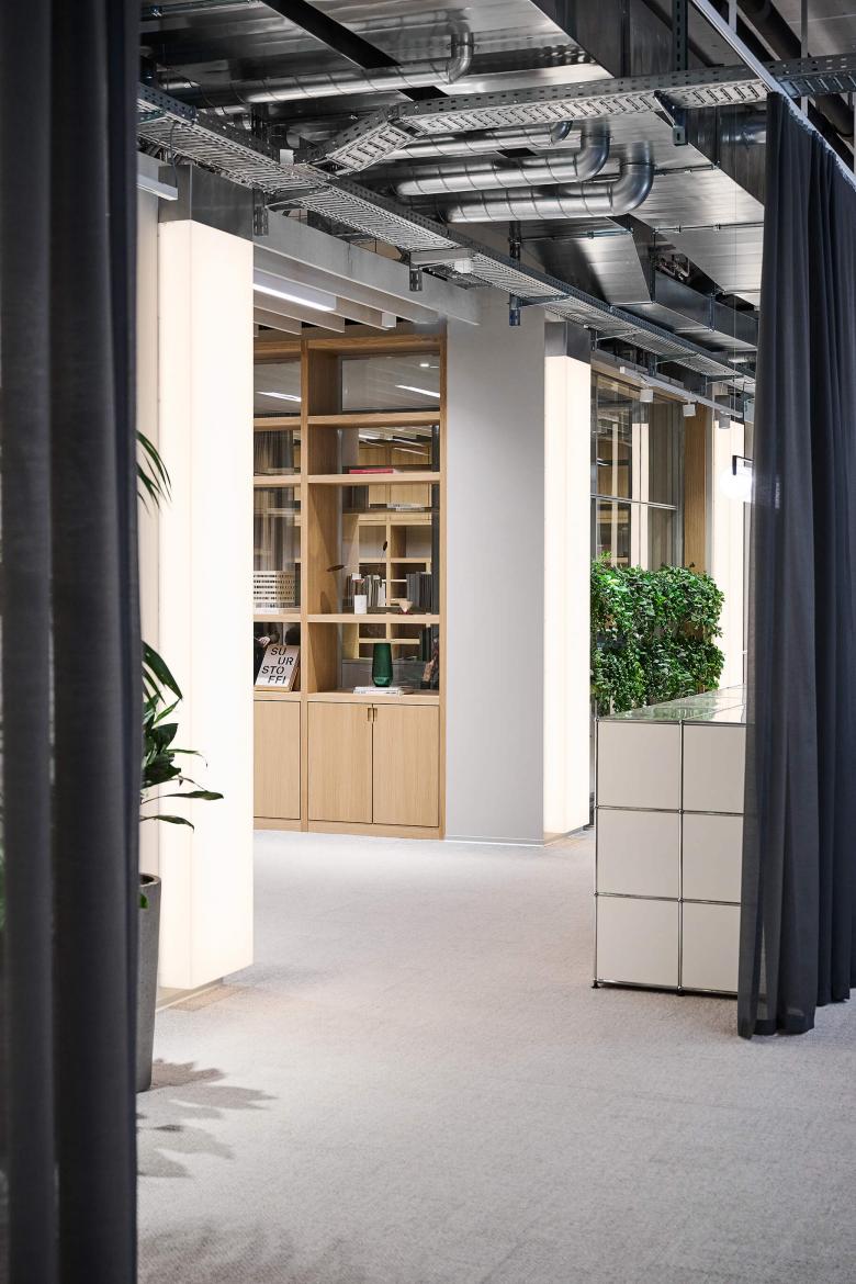 Die durchdachte Integration von Licht ist ein wesentliches Merkmal des Büros. Tageslichtwände durchziehen das Büro, versorgen es mit Licht und schaffen eine inspirierende Arbeitsatmosphäre. Gleichzeitig wurden die Büroräume durch raumhohe Regalverkleidungen geschickt und dezent in den Raum integriert, so dass eine harmonische Balance zwischen offenen Arbeitsbereichen und diskreten Einzelbüros entstanden ist.