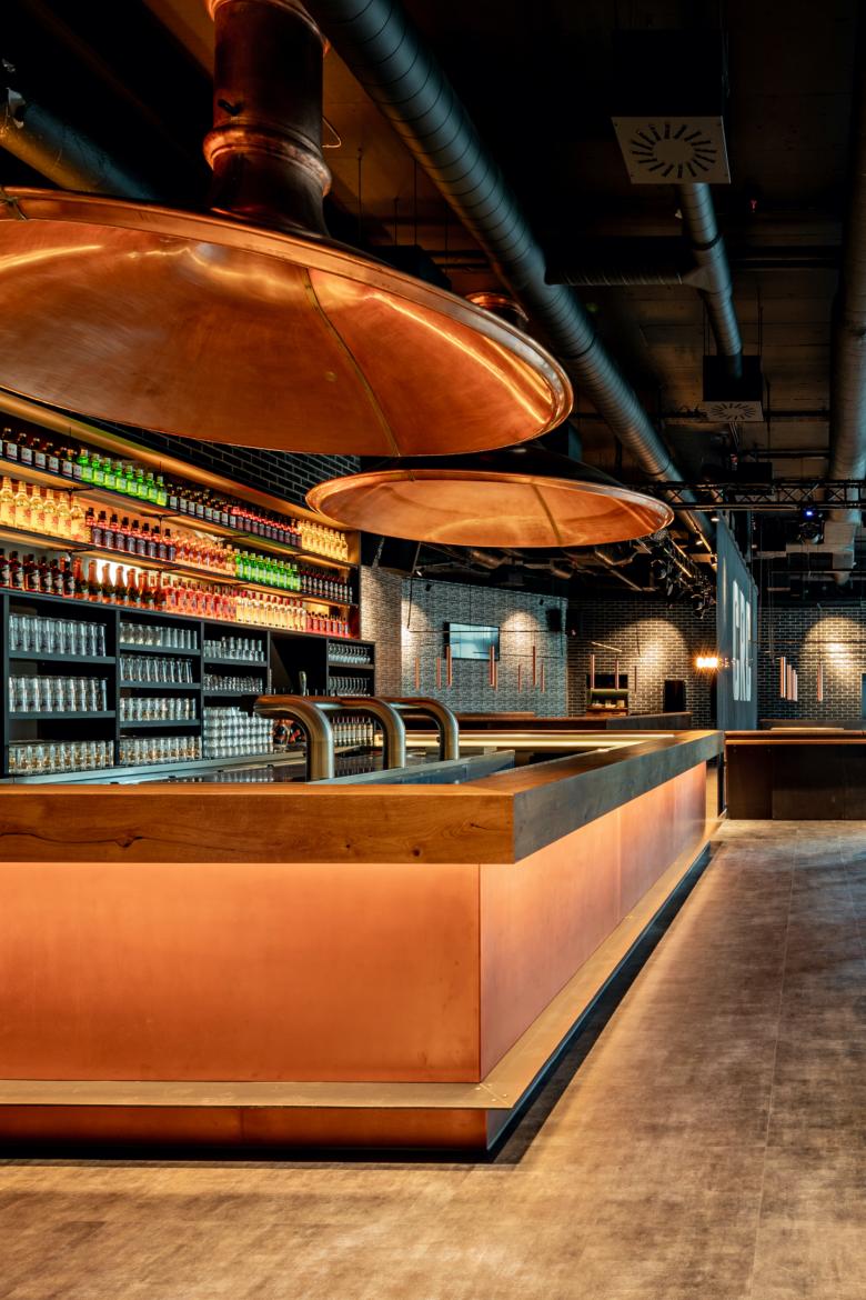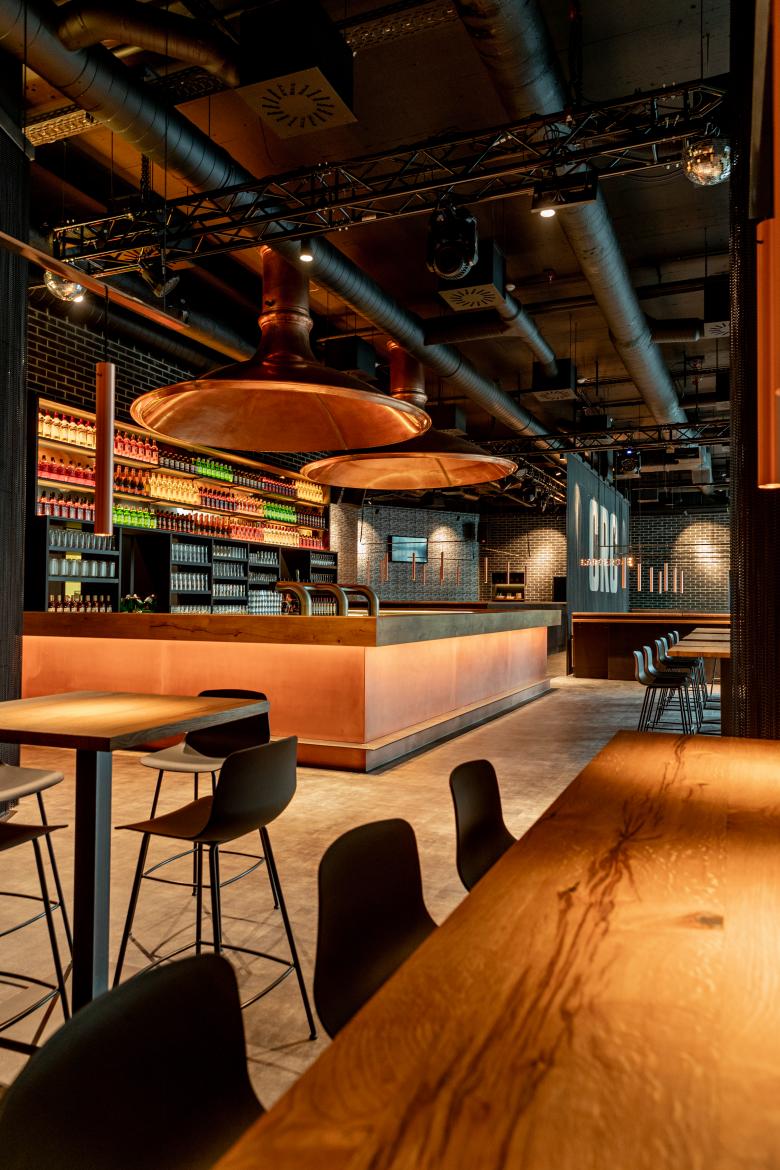 Das Classic Rock Café, kurz CRC, musste seine renommierte Kellerräume wegen einem Neubau in Stuttgart-Mitte weichen. Die Betreiber suchten nach neuen Räumen. Fündig wurden sie in einer städtischen B- Ebene am Übergang von der Innenstadt zur Universität. Die U-Bahnhaltestelle Börsenplatz öffnet sich hier in einem großen Halbrund zum Himmel. In der Tiefebene war bisher ein Mexikaner zuhause; diesen Sommer eröffnet das neue CRC. Die vertraute Kellerlage bleibt den Gästen also erhalten. Dafür verfügt der neue Standort erstmals über einen Außenbereich. Für die Neugestaltung holten sich die Betreiber den Stuttgarter Innenarchitekten Cyrus Ghanai an die Seite, dem die Stadt bereits so einige Gastronomie-Highlights verdankt. Die 325 Quadratmeter des neuen CRC hat Ghanai durch große Podeste gegliedert. In der Raumtiefe liegt der erhöhte Loungebereich, von dem aus der Blick ungestört durch das Lokal wandern kann. Hinter dem Eingang wiederum entstand, ebenfalls erhöht, ein kleiner Restauranttrakt, der durch einen Kettenvorhang von Kriskadecor zusätzlich abgeschirmt ist. Das zentrale Element des neuen CRC bildet allerdings der riesige Bartresen in der Raummitte. Die zwei markanten Kupfertrichter, die darüber schweben, sind aus der alten in die neue Location mitgewandert. Jeder Raumbereich besitzt eine eigene, auf die jeweils angedachte Nutzung abgestimmte Möblierung. So entwarf Ghanai etwa unterschiedliche hohe Tische – hier zum Essen, dort zum Chillen, an anderer Stelle zum entspannten Miteinander auf halber Höhe zwischen Sitzen und Stehen. Besonders gelang auch die Gestaltung der Wände. Dafür wurden Schriftzüge bekannter Rockbands verfremdet und auf Tapetenbahnen arrangiert. Auf den ersten Blick wirkt das vor allem dekorativ – auf den zweiten Blick auch noch unglaublich charmant und unterhaltsam.