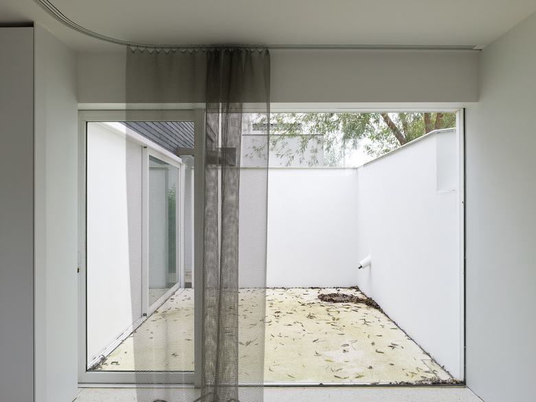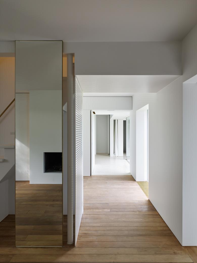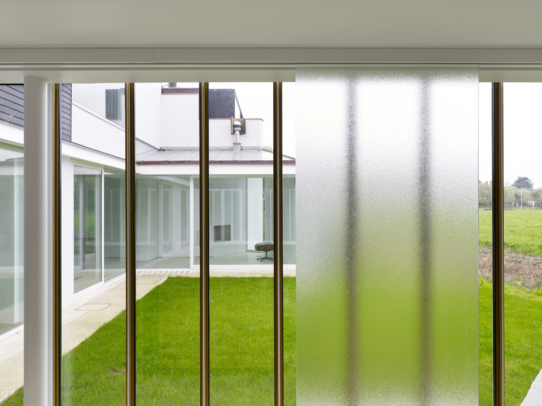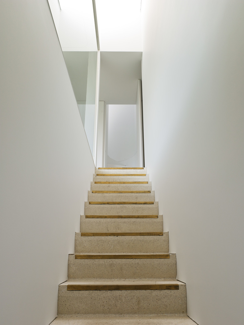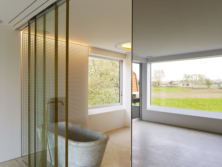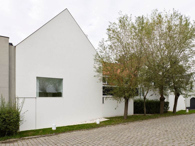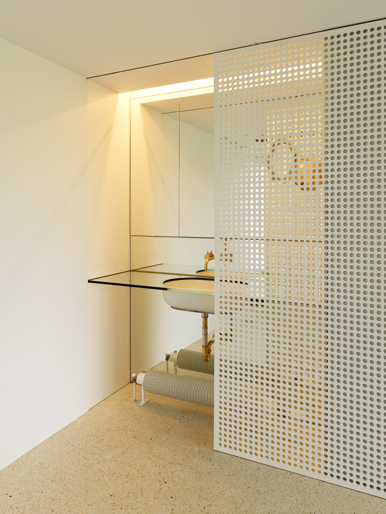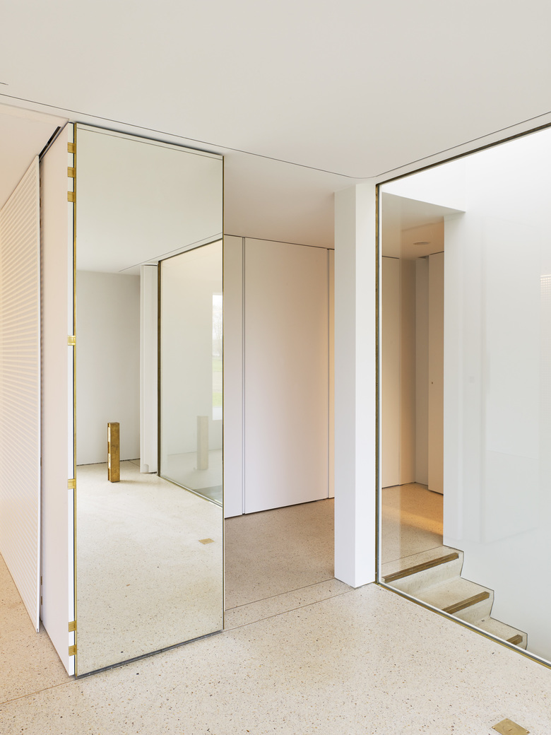 Inside, the need for space, tranquillity, intimacy and light was fulfilled while maintaining complete privacy. Nothing on the inside is what it looks like from the outside. The whole house was conceived by the idea of not immediately giving away its secrets but still offering the sufficient perspectives. The interior is deliberately kept simple and neutral: sleek white walls, concrete floors (in the newly-built section) in combination with many brass accents. The owner - an art collector - can, without detracting the spaces, design according to his own imaginary perception, completely withdrawn, reclused from the outside world. This in a period of time where one's characteristics & assets, more often than not, are displayed for everyone to see, leaving little for one's imagination.