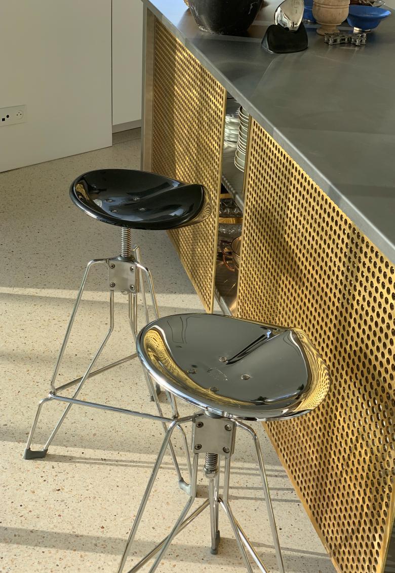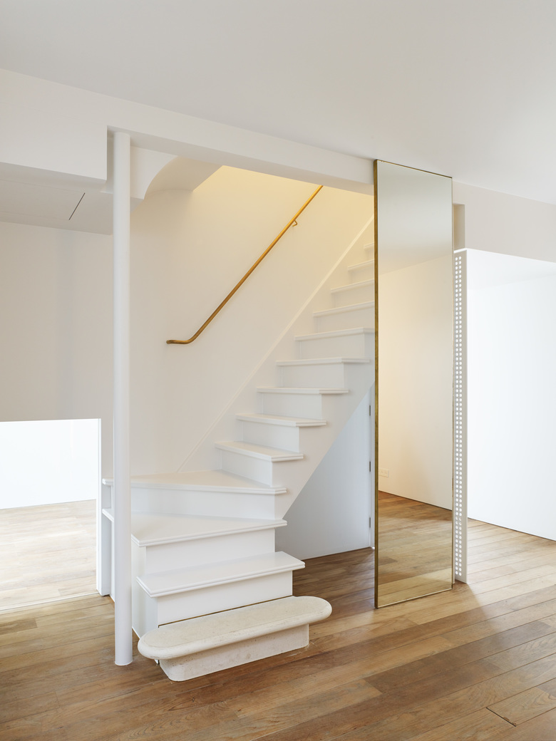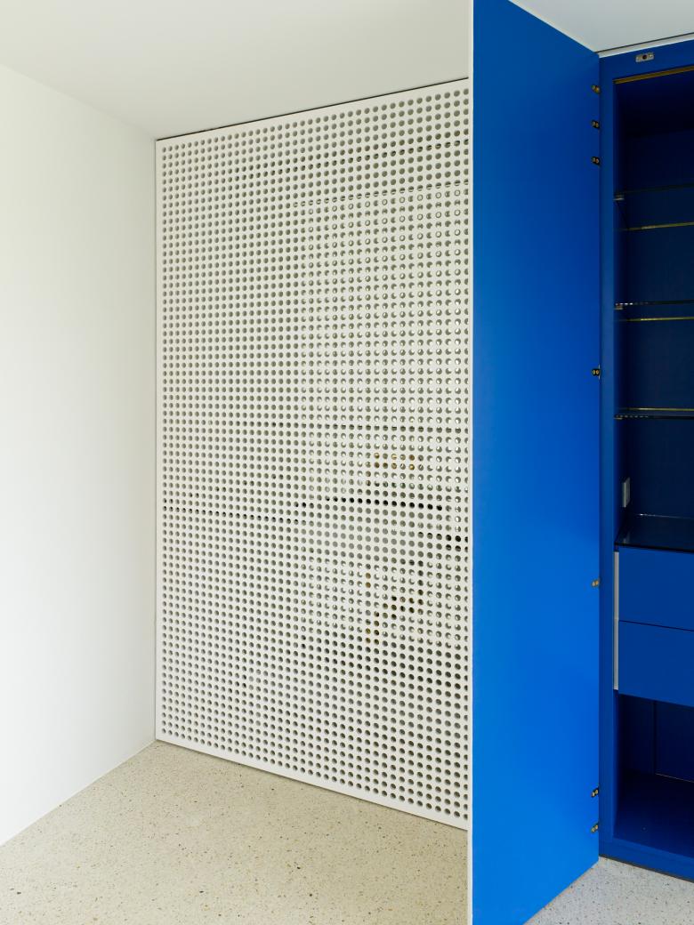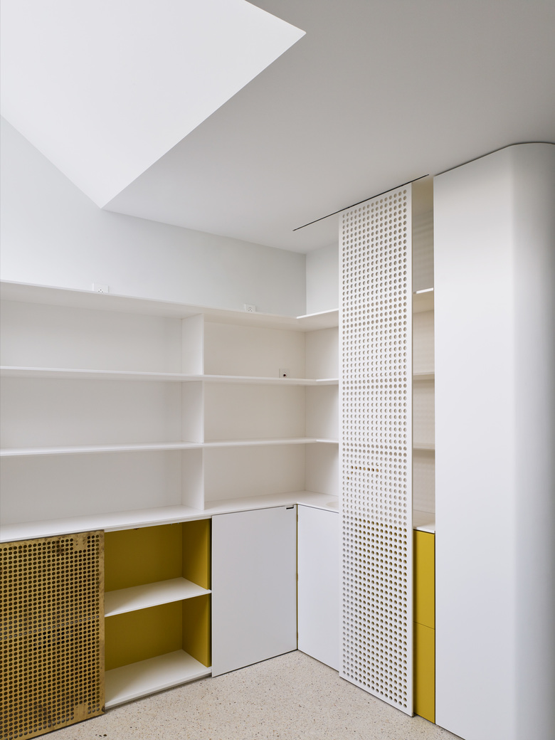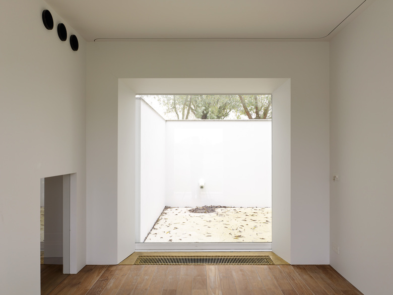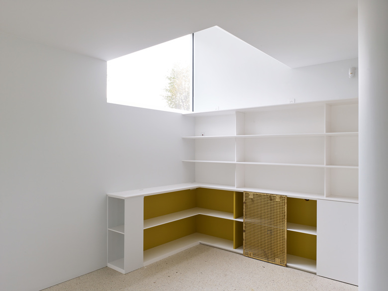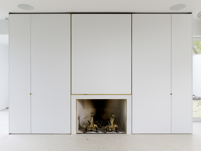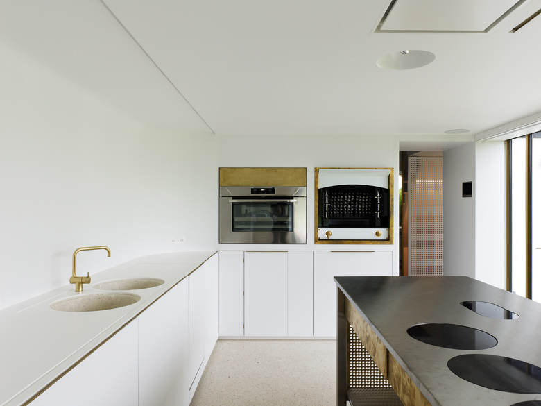 Inside, the need for space, tranquillity, intimacy and light was fulfilled while maintaining complete privacy. Nothing on the inside is what it looks like from the outside. The whole house was conceived by the idea of not immediately giving away its secrets but still offering the sufficient perspectives. The interior is deliberately kept simple and neutral: sleek white walls, concrete floors (in the newly-built section) in combination with many brass accents. The owner - an art collector - can, without detracting the spaces, design according to his own imaginary perception, completely withdrawn, reclused from the outside world. This in a period of time where one's characteristics & assets, more often than not, are displayed for everyone to see, leaving little for one's imagination.