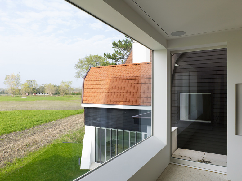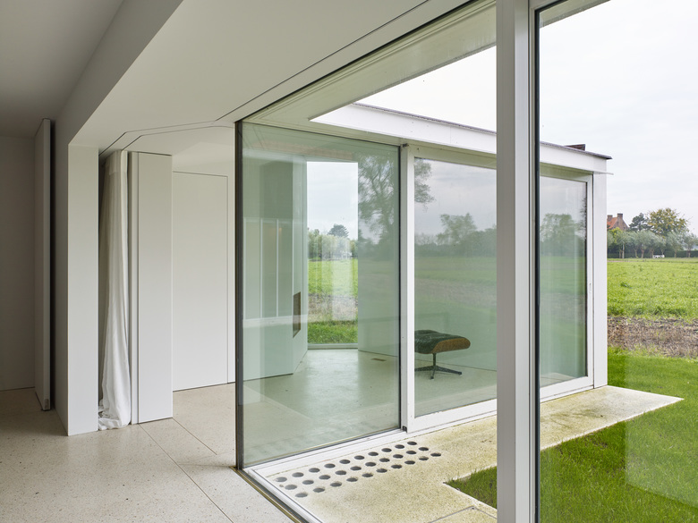 Nowadays, the levee no longer has a sea-diverting function. The levee has been excavated in many places but not where the project is located. At the beginning of the 15th century a street was built on the levee. The buildings along the Graaf Jansdijk ,on the north side of Knokke – towards the Netherlands ,are very heterogeneous. Low, whitewashed farm workers' houses have been built against the levee, often used today as holiday homes. The client was in possession of such a small workers' house and, instead of breaking down the little house and building a bigger one, he decided he wanted to expand and renovate the small workers’ house to a home where he could reside permanently. The existing small home was completely renovated and more living space was added. The design for the outbuilding, in the middle of the Zwinpolders, had to be in function of its environment - to an extent that the house is completely blending in with its surroundings. The architects were convinced the design had to have a certain simplicity, even a primitive external appearance, such as the old farmer houses on the levee. In the last decades, houses have been renovated along the levee and built in a similar style, in a way that they are intertwined with the existing farmer's workers' houses. And so a small “ribbon village” with open and enclosed outdoor spaces, with fascinating perspectives, was created.