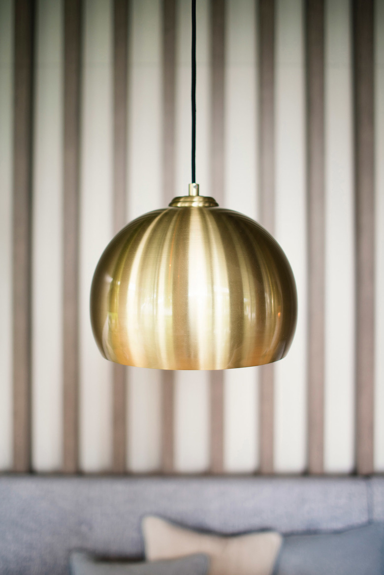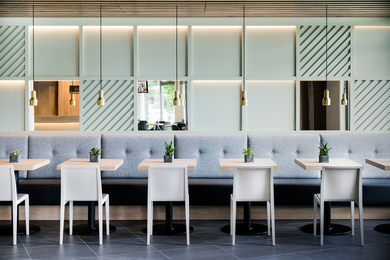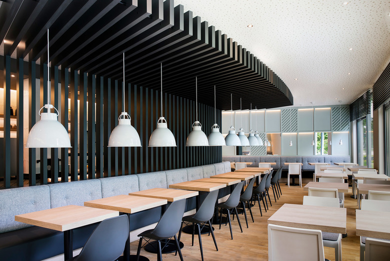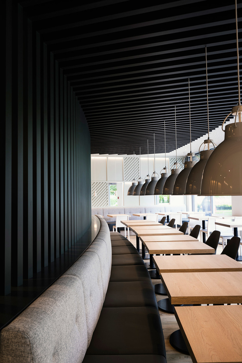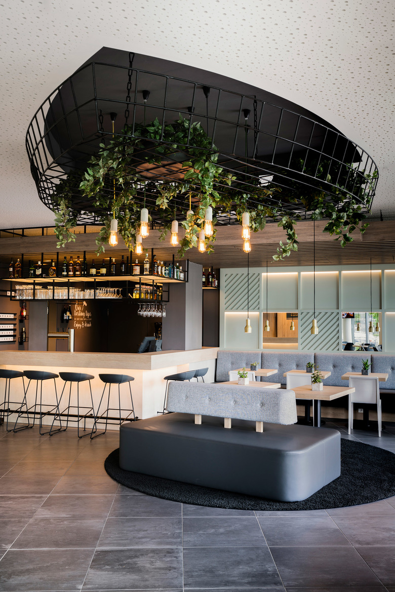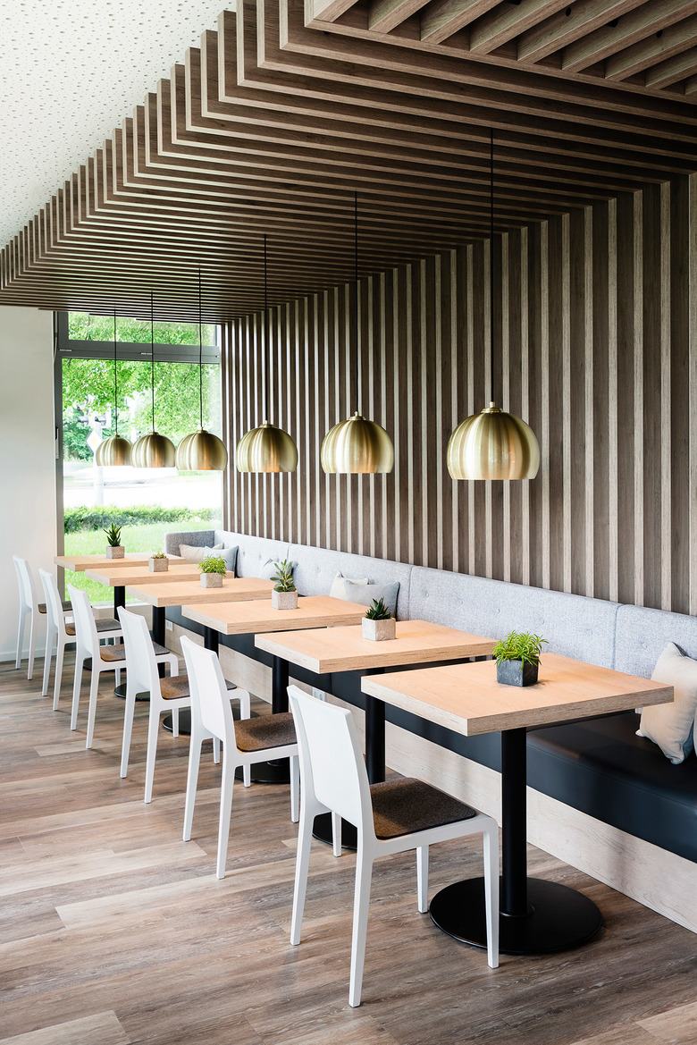 Ein wiederkehrendes Charakteristikum sind die linear angeordneten Holzlamellen zur Zonierung verschiedener Bereiche. Ihre grafische Struktur wird durch die Anordnung der Pendelleuchten und Tische verstärkt. Im Restaurant greifen sie die Rundung der Fassade auf und verleihen dem Raum Dynamik. Raumprägend ist zudem eine traditionelle Wandvertäfelung in den Nischenbereichen, die mit modernen Leuchten und Industrieästhetik kontrastiert. Letztere findet sich beispielhaft in einer lackierten Stahlmatte, die sich im Eingang als Deckeninstallation präsentiert.
