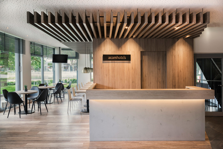 Das acomhotel München integriert sich mit einer neuen Fassade in die Umgebung und verweist im Inneren auf diese zurück. Diese Veränderung ist schon aus der Ferne ersichtlich. Die Stimmung der Residenzstadt mit ihrer mächtigen Grünanlage wird durch Farbe und Material in Raum übertragen. Würdevoll und modern bestimmen Gold und Ocker sowie Mint und Eiche die Atmosphäre der neu gestalteten Empfangs- und Restaurantfläche.
