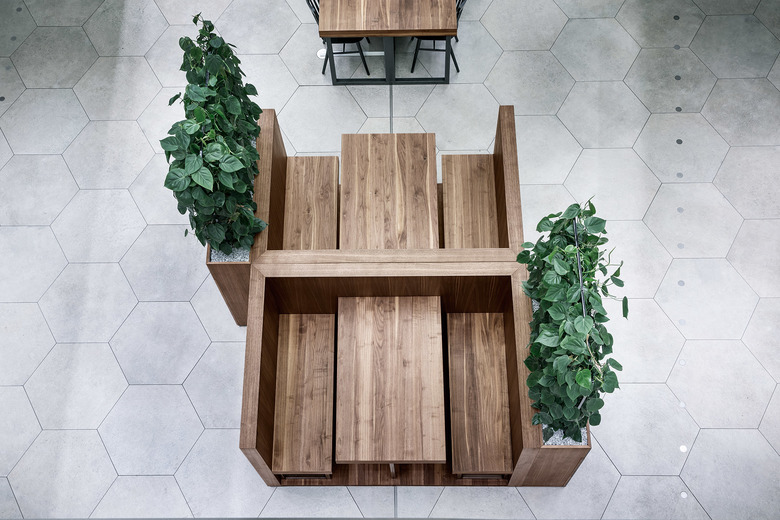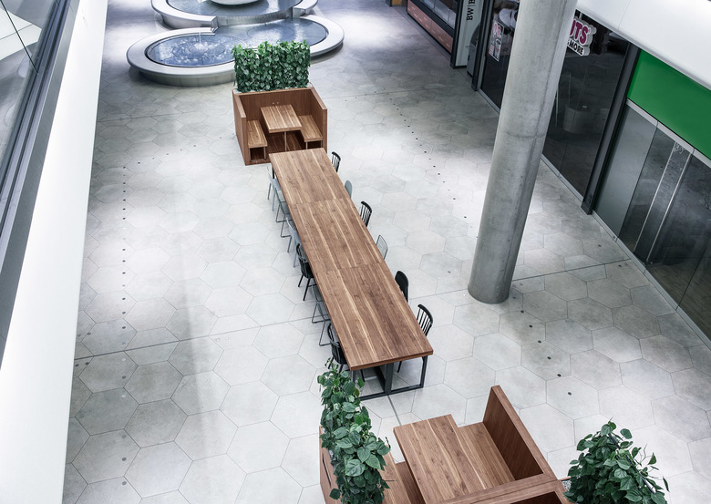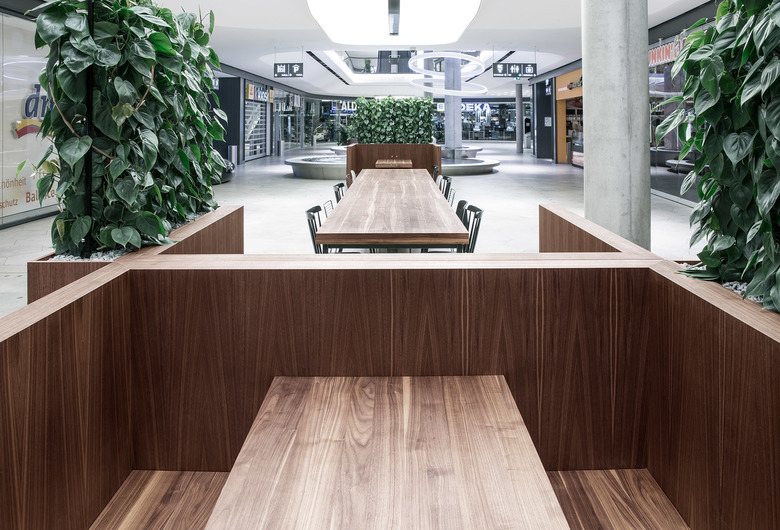 Die Idee des Food Corners: Alle Passanten an eine gemeinsame Tafel bringen. Das Möblierungskonzept besteht aus zwei langen Tischen aus Nussbaumholz mit individueller Bestuhlung. Edel und cool, jeder ist willkommen und kann bei Pasta, Gegrilltem oder Salat gleich noch das Smartphone laden – die Tische verfügen über 16 USB-Ladestationen. Up to date. Up to snack. Diese Stimmung wird durch Grünpflanzen abgerundet. Auf allen Etagen des Einkaufzentrums bieten diese Sichtschutz im Bereich der Sitzinseln. Die runden Holzmodule sind aus demselben Material und fügen sich in die Umgebung ein.