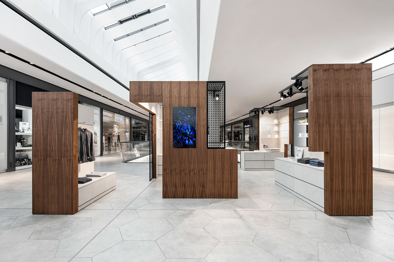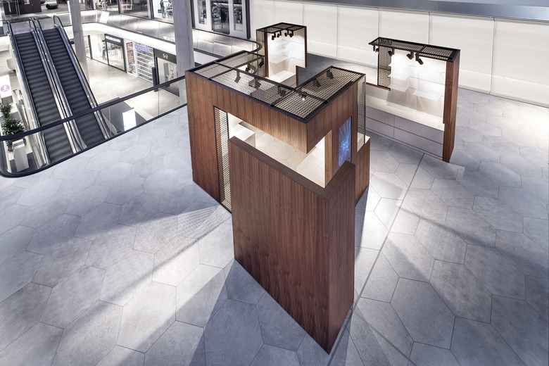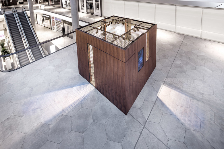 Ein zentraler Technik-Kniff ist das integrierte Hubsystem: Der Händler kann drei der vier Einzelelemente frei im Raum bewegen und schafft sich seinen eigenen Verkaufsraum von etwa 20 bis 30 Quadratmetern, der zugleich barrierefrei ist. Das Ladenbausystem auf den Innenseiten der Elemente ermöglicht eine flexible Anbringung von Waren. Zwei Monitore auf den Außenwänden werden mit visuellem Bildmaterial beliefert.