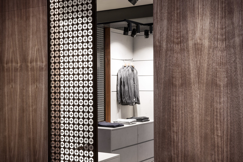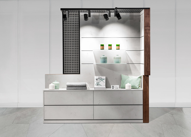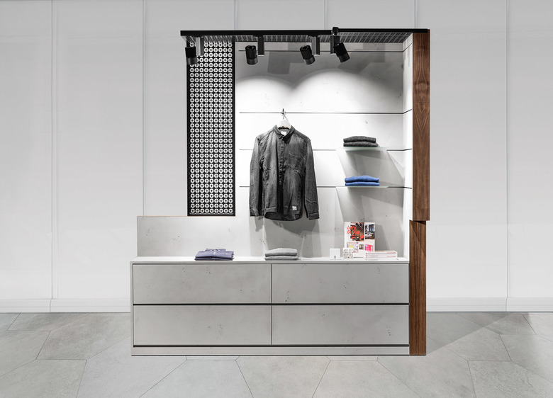Das Design verfolgt zwei Ziele: Es fügt sich in die Architektursprache des übergeordneten Raumes ein und wird einer Vielfalt an Präsentationsinhalten gerecht. Edles Nussbaumholz spricht für Wertigkeit und Natürlichkeit. Der Braunton kontrastiert mit den Natursteinfliesen der Umgebung und den Innenseiten der Box. Der helle Beton dieser Flächen spricht für sich, ist modern und gleichzeitig zurückhaltend genug um den Produkten nicht die Show zu stehlen. Das schwarze Lochblech greift das Unternehmens-Logo auf.