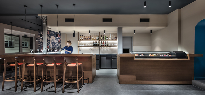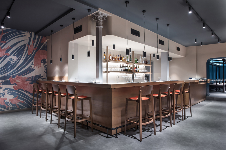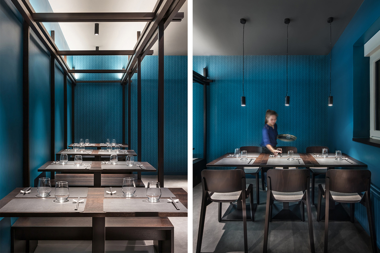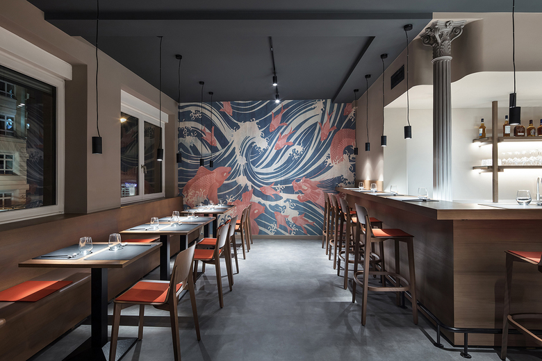 Die traditionelle japanische Steckbauweise diente als Inspirationsquelle für ein wiederkehrendes dekoratives Element: Die Konstruktion mit der Anmutung eines Holzknotens findet sich im Windfang, Bar-Regal, in der Deckeninstallation entlang des Banketts sowie im Kojen-Element der hinteren Zone wieder. Integrierte LED-Schienen und Pendelleuchten setzen diese Knotenform in Szene: Auch hier zeigt das Wechselspiel zwischen Licht und Schatten seine Wirkung.
