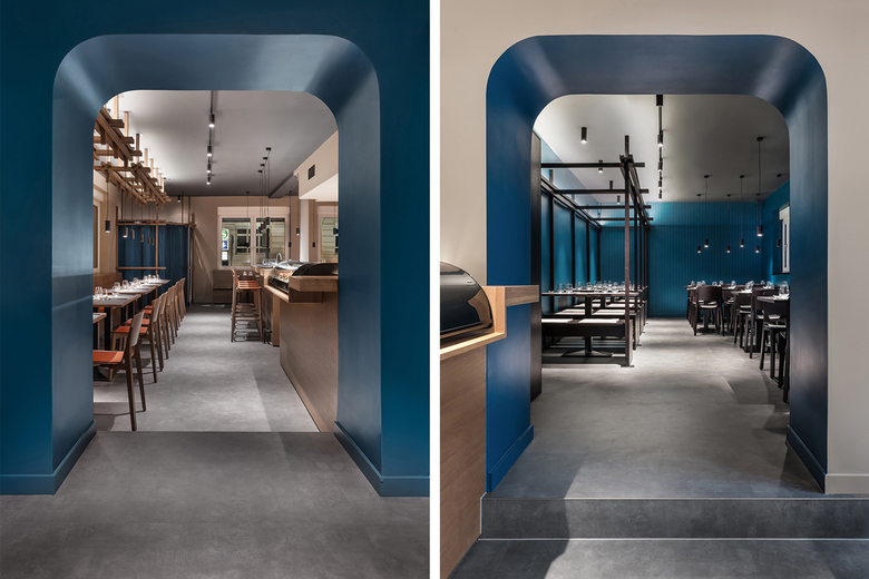 Licht und Schatten – ewige Dualität oder perfekte Ergänzung? Das faszinierende Wechselspiel hat sich in dem japanischen Essay „Lob des Schattens“ bereits als Entwurf einer japanischen Ästhetik etabliert. Schon der Name Akeno mit der Bedeutung „hell leuchtend“ verweist auf diese Thematik, die sich durch das gesamte Raumkonzept zieht. Das 100 Quadratmeter große Restaurant wurde in zwei Zonen – hell und dunkel – unterteilt. Im vorderen Bereich wirken die beigefarbene Wandfarbe und helle Eichenholzmöbel prägend, im hinteren Bereich sind es Petrol und dunkel gebeizte Möbel. Je nach Bedürfnis können die Gäste in freundlicher, ungezwungener oder privaterer Atmosphäre speisen, während die Zu- oder Abschaltung einzelner Lichtkanäle die Raumstimmung unterstützt. Ein Torbogen verbindet beide Zonen miteinander. Schon bei Eintritt in das Restaurant lässt diese Öffnung den Blick in den hinteren Raum zu, macht neugierig und verdeutlicht den Hell-Dunkel-Kontrast.