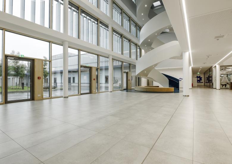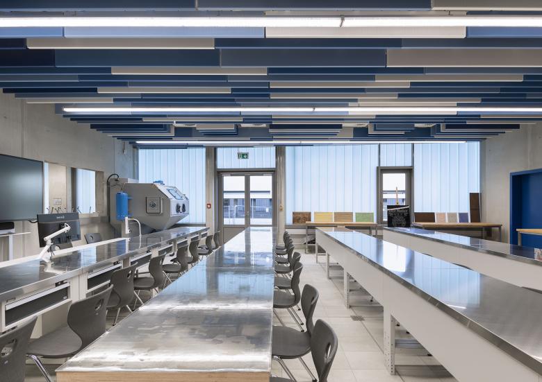 Die von DÖMGES ARCHITEKTEN geplante Berufsschule I (Gewerblich-Technische Berufsschule) gibt mit seinen großen Werkhallen für die verschiedenen Fachbereiche ca. 2.000 Berufsschüler*Innen neue Lehr- und Ausbildungsräume.
