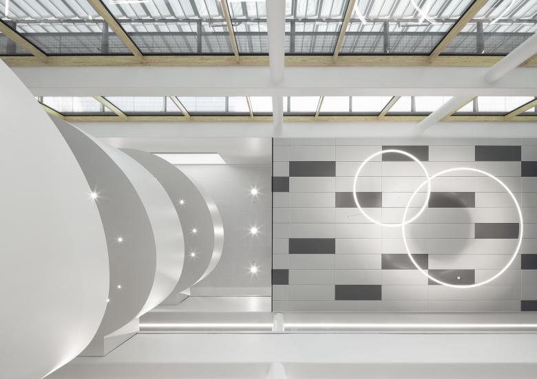 Von der Decke aus leuchten große, dünne LED Leuchten in Kreisform den Raum aus. Die verschiedenen Fachbereiche haben jeweils ein eigenes gestaltetes Symbol erhalten. Die Metalltechnik ist beispielsweise an einem großen Zahnrad zu erkennen.