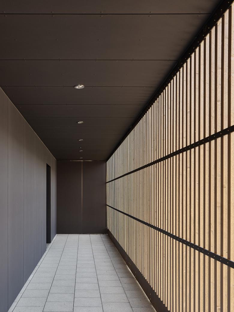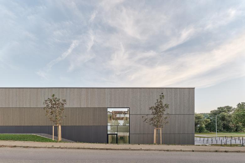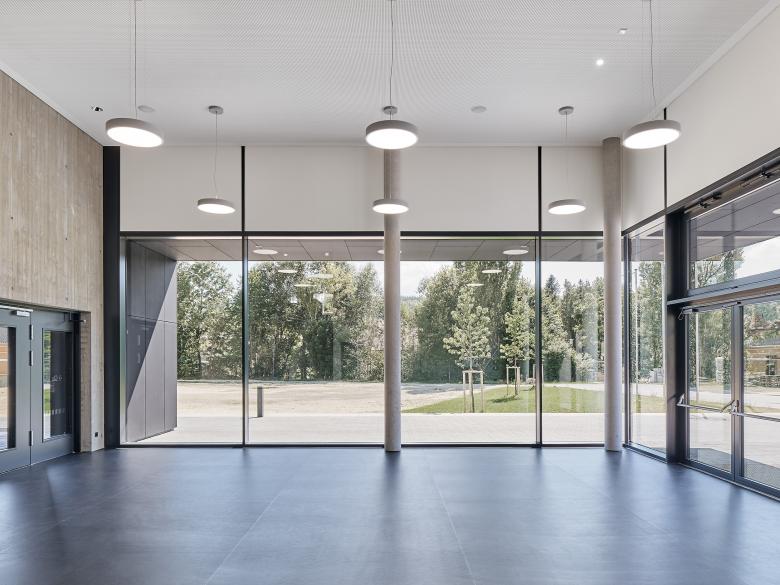 Die Stadt Lauchheim benötigte einen Ersatzneubau für die in die Jahre gekommene Alamannenhalle aus den 60-er Jahren. Die neue Mehrzweckhalle kompensiert durch seine straßennahe Lage den starken Höhenunterschied zwischen Straße und Jagstaue und schafft damit Platz für eine großzügige Fest- und Spielwiese entlang des renaturierten Flussufers. Zentraler Raum für große Veranstaltungen ist die 3-teilbare Halle, die über ein zweigeschossiges Foyer erschlossen wird. Für Veranstaltungen ist eine 80 qm große Klappbühne an der Stirnseite der Halle vorgesehen. Im Innenraum dominieren die Eigenfarben von Sichtbeton in Glatt- und Brettschalung als robuste langlebige Oberfläche in Kombination mit hell lasierten Fichteholzpaneelen. Der durchgängig schwarz gehaltene Linoleumboden wird außen mit dunklem Betonpflaster weitergeführt und verbindet somit den Innen- mit dem Außenraum. Die reduzierte Farbwahl eignet sich sowohl für Sport- als auch für Veranstaltungsnutzung.
