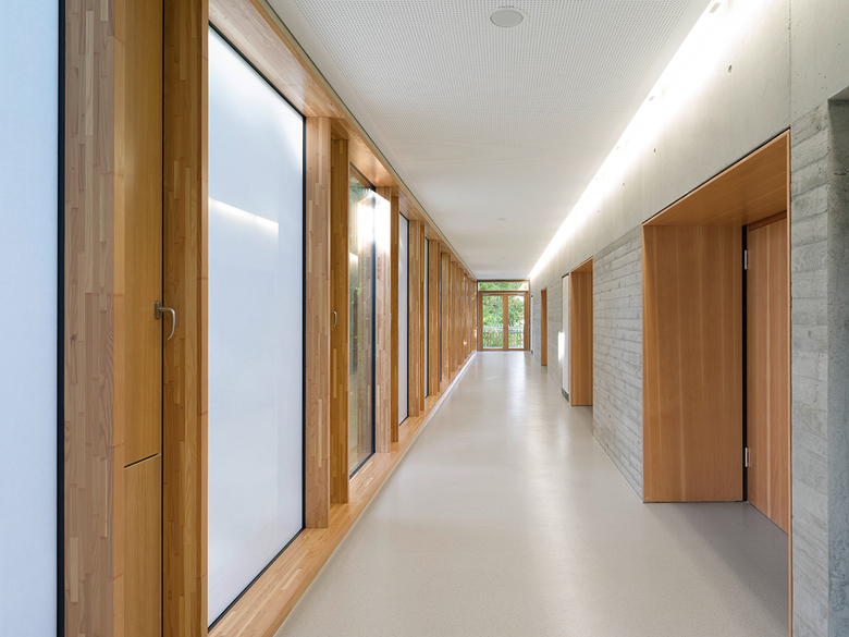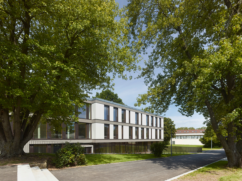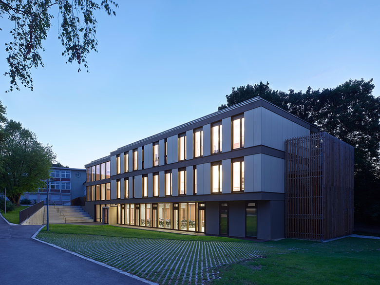Eine Schulanlage aus den 50-er Jahren mit dreigeschossigem Hauptbau und eingeschossigen Pavillonbauten war um eine Mensa, Schüleraufenthalts- und Fachklassenräume für Biologie und Physik zu erweitern. Der Neubau schließt direkt an den winkelförmigen Hauptbau an. Ein Zwischenglied nimmt den neuen Eingangsbereich, Treppe, Aufzug und WC-Räume auf. Der im Altbau südseitig angeordneten Flur wird hier auf die Nordseite des Neubaus umgeleitet, damit alle neugeschaffenen Räume in den Genuss der Südsonne und des Ausblicks in die grüne Mitte des Schulgeländes kommen. Die Mensa mit 96 Tischplätzen und eine Aufwärmküche liegen im Sockelgeschoss, die Schüler-aufenthaltsräume im mittleren Geschoss, die beiden Fachklassen und ein Vorbereitungsraum im Obergeschoss. Putzbänder im Deckenbereich gliedern die Fassaden aus geschosshohen Verglasungen und Faserzementplatten.