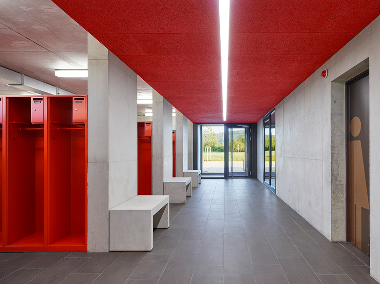 Auf freiem Feld am Rand eines Teilorts von Winnenden war ein neues Feuerwehrhaus zu planen, das optimale Betriebsabläufe im Innenbereich wie auch im Außenbereich für die Zu- und Abfahrten mit zwei Anbindungen an die Landesstraße schafft. An einer Wagenhalle für 4 Einsatzfahrzeuge liegen im Erdgeschoss Geräteräume, Umkleiden, Bereitschaftsraum und Funkraum, im Obergeschoss ein Verwaltungs- und ein großer Schulungsraum. Der 13 m hohe Übungsturm als kleine Dominante und Symbol für den Gebäudeinhalt schließt den Baukörper nach Norden ab. Die Fassaden sind horizontal mit farbig lasierten Latten aus Lärchenholz verkleidet, der Eingangsbereich wird mit Faserzementplatten betont. Der Übungsturm setzt sich aus drei Sichtbetonwänden zusammen, in die eine Gitterrosttreppe eingestellt ist, von der die Übungsbalkone auskragen.