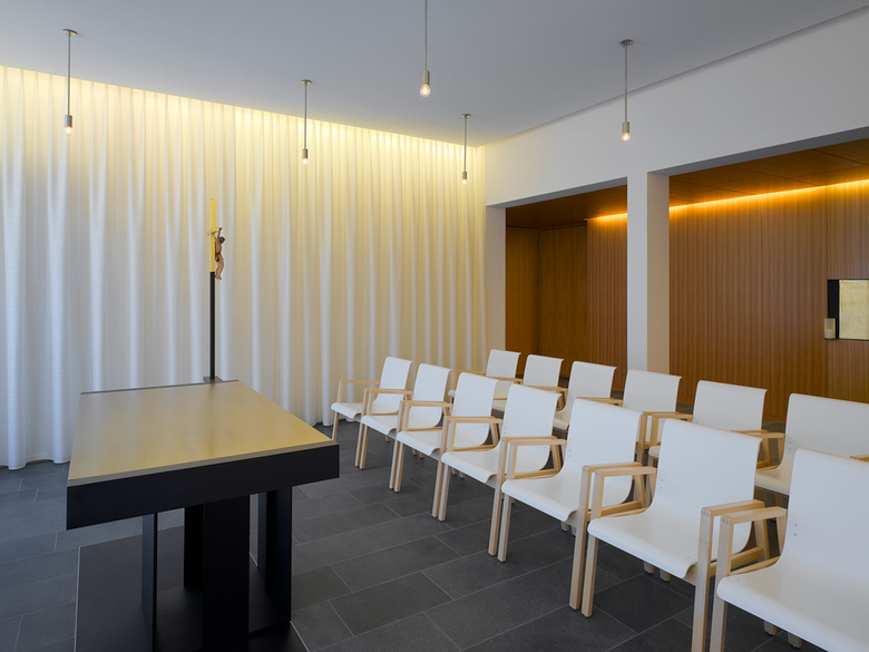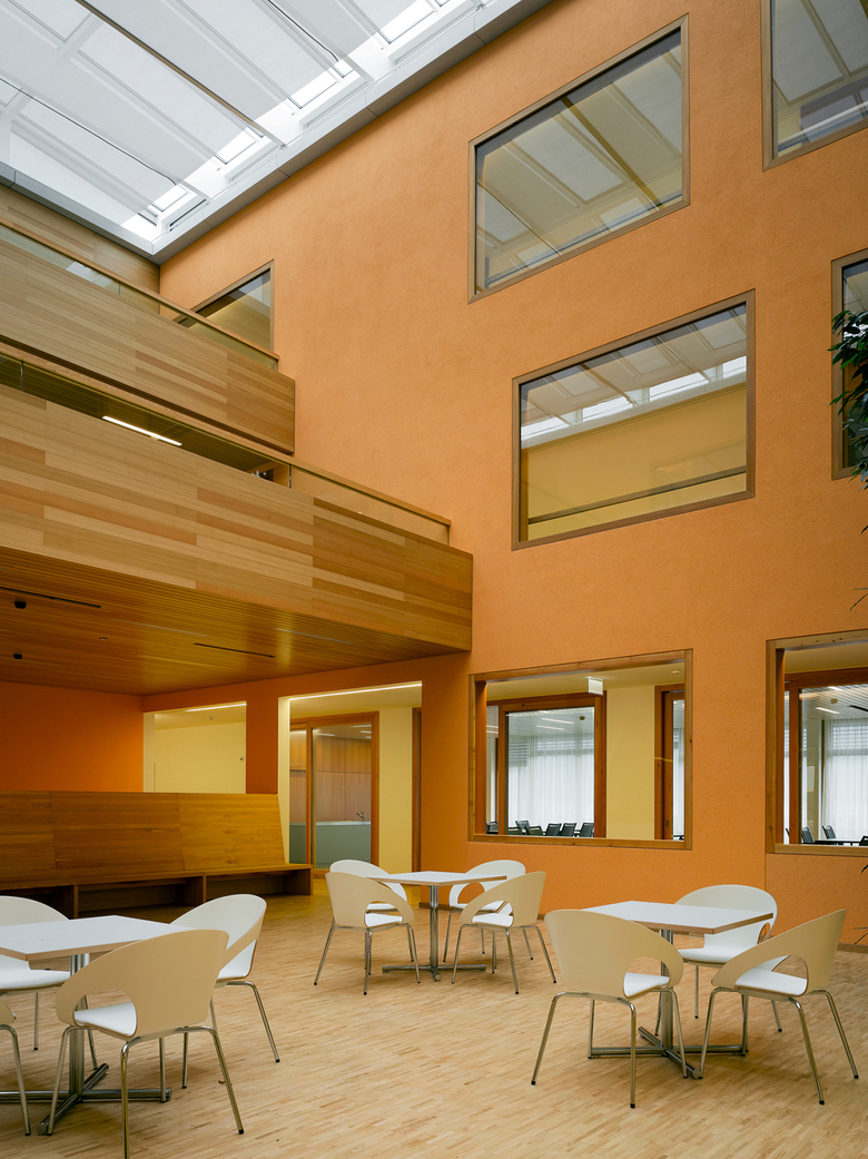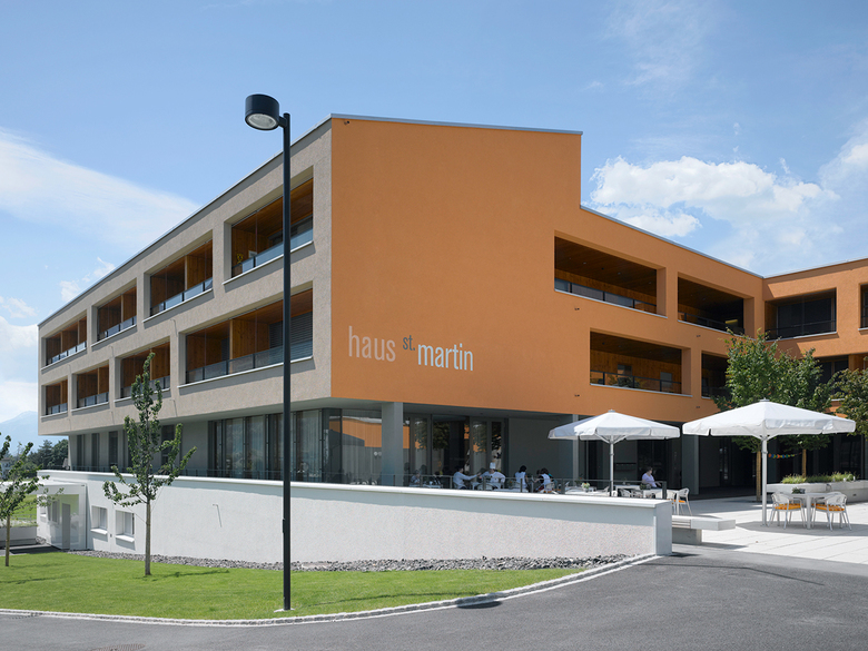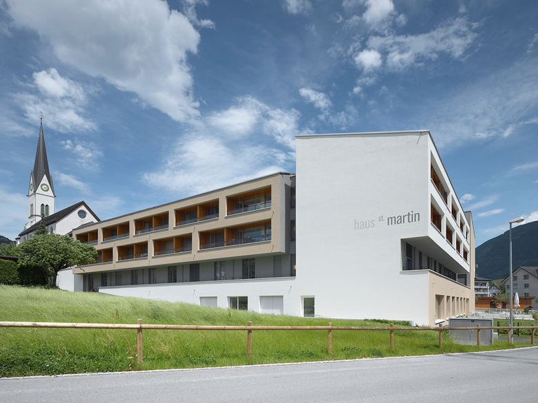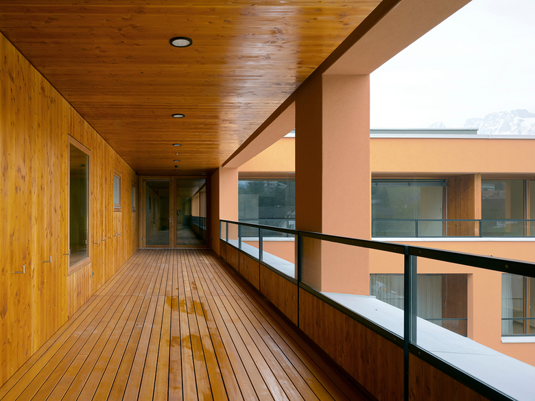 Im Ortskern hinter Kirche und Friedhof entstand am Südhang ein komplexes Pflegezentrum. Zwei Obergeschosse beherbergen 4 Pflegestationen mit insgesamt 54 großzügigen Bewohnerzimmern sowie Gemeinschafts- und Dienst-räumen. Erd- und Hanggeschoss sind mit weiteren zentralen Räumen wie Andachtsraum und Mehrzwecksaal belegt, vor allem aber mit verschiedenen öffentlichen Einrichtungen von einer Kinderspielgruppe über Familienberatungsstellen bis zu Seminarräumen eines Vereins. Den kommunikativen Mittelpunkt des Hauses bildet ein glasgedeckter Innenhof, der wie ein Dorfplatz zum Verweilen, Sehen und Gesehenwerden über alle Geschosse einlädt. Das große Bauvolumen ist in mehrere, innen wie außen deutlich ablesbare Baukörper gegliedert, die sich jedoch insgesamt zu einem kompakten Gebäude verzahnen, das energetisch dem strengen Schweizer Minergie-Standard entspricht.