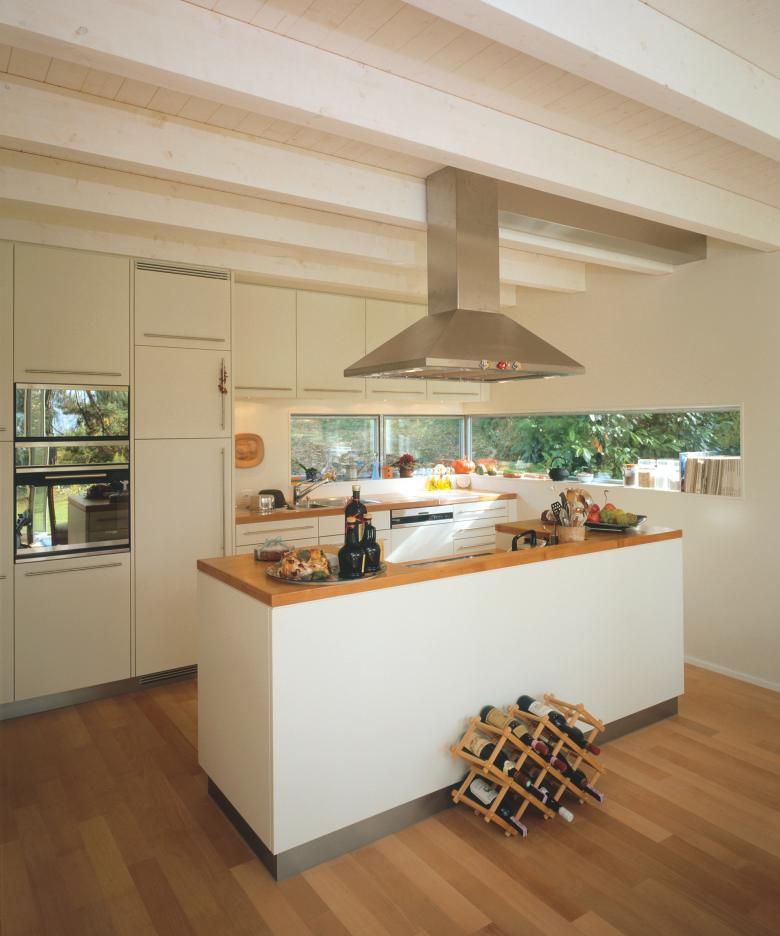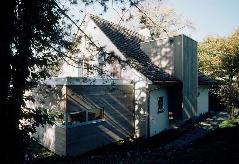 Da das kleine, charmante Wohnhaus aus den 40er Jahren, auf einer Geländeterrasse über dem Zürichsee gelegen, nicht mehr den aktuellen Bedürfnissen entsprach, musste es angepasst und erweitert werden. Die Entwurfsabsicht bestand darin, die alte Struktur beizubehalten und durch zwei verschiedene, präzis definierte Eingriffe zu ergänzen: Zum einen den eingeschossigen, horizontal orientierten Baukörper seitlich der Südfassade, der die Küche und das Esszimmer beinhaltet; zum anderen das vertikale Volumen mit der Erschliessung. Der horizontale Baukörper zeigt eine waagrechte Schalung mit einem tiefliegenden, seitlichen Eckfenster. Das vertikale Volumen weist eine senkrechte Schalung mit einem Oberlicht auf. Der unterschiedlich natürliche Lichteinfall und die Art, wie sich die einzelnen Räume zum Aussenraum beziehen, verstärken deren unverwechselbare Identität. Um das Wohnhaus in seinem stimmungsvollen Charakter nicht zu beeinträchtigen und um es in seiner Dominanz zu wahren, wurden zurückhaltende Materialien und Farben gewählt. Bewusst wurde eine leichte, schwebende Erscheinung der Volumen gewählt, um das bestehende Wohnhaus in seiner Dominanz zu wahren.