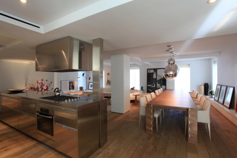 The modern 220 m2 apartment, in the city’s first residential conversion (the emblematic Barbizon) was just the starting point for Fernanda Marques’ first project in the Big Apple following her first commercial initiatives abroad. From the original floor plan, “nothing is as it was”, and the Brazilian architect kept the not-so-high and beamed ceiling, rather than putting up a traditional plaster ceiling that evens out everything, a no-no among local architects. “I took the beams on!”, she says. Pristinely off-white, the space is designed around the “old versus new” idea, with its reclaimed wood floor throughout the apartment, finished with a matt resin. The client – who had already commissioned other projects from her in Brazil – displays his passion for art, music and wine in the apartment. “He is bold, athletic and young at heart”, says Fernanda, who brought the three guitars that take up the wall in one of the bedrooms out into the lounge, “giving them a prominent role in the setting, as he plays the instrument” – a bit of gossip: one of them came from Van Halen