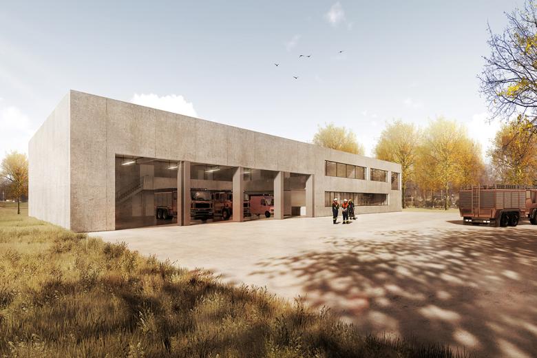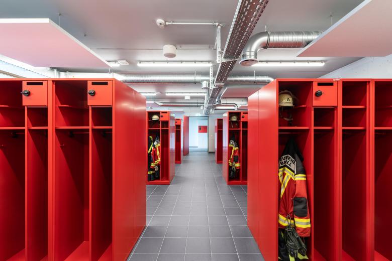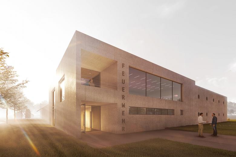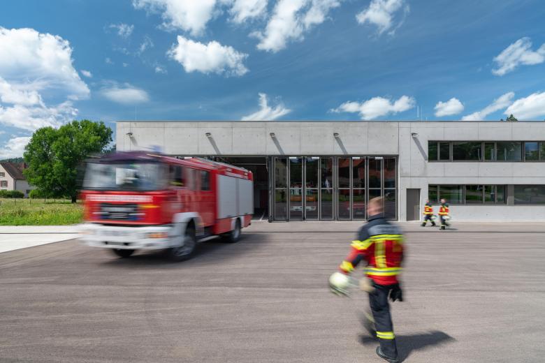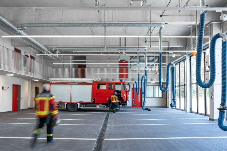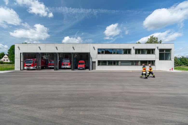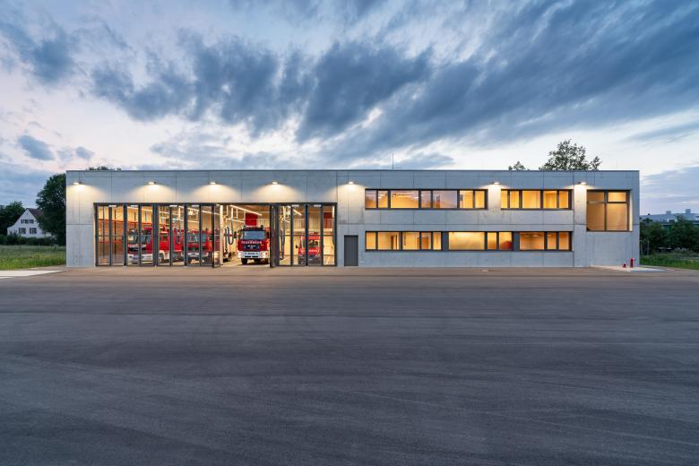 Das Gebäude umfasst neben Umkleiden, Aufenthalts- und Schulungsräumen eine moderne Fahrzeughalle. Durch die konsequente Ausführung in Sichtbeton und Glas wird die Funktionalität zwar betont. Die Formensprache verleiht dem Gebäude aber eine hohe ästhetische Qualität und individuelle Anmutung.
