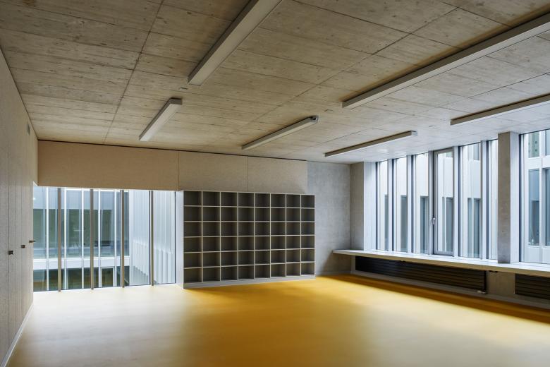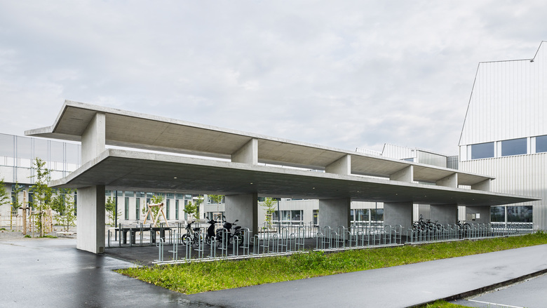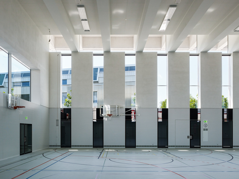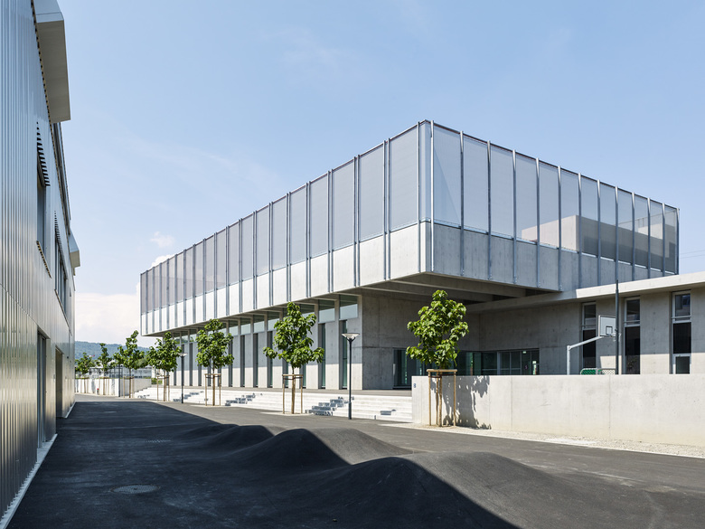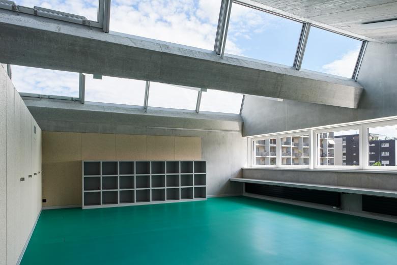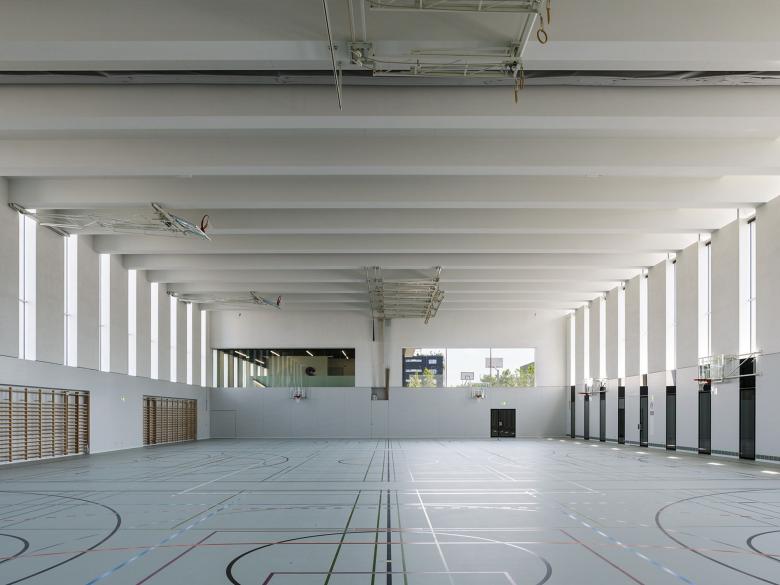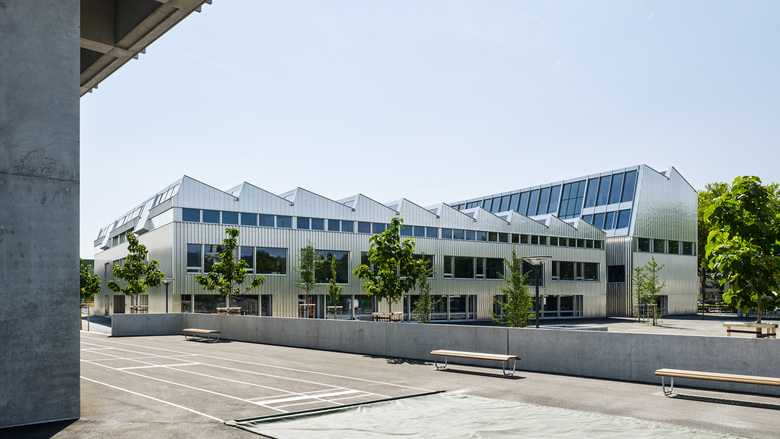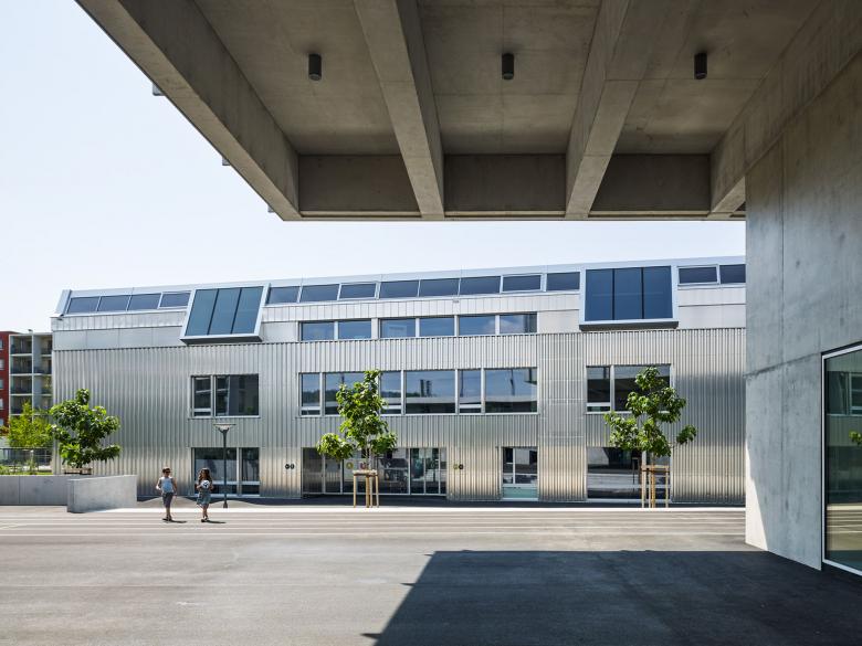 Entsprechend dem Genius Loci prägen ,edelrohe‘ Bauten in differenziertem Kleid und ein Sheddach von ikonografischer Kraft den neuen Schulstandort / Der Hauptteil des Raumprogrammes wird in einem 3-geschossigen Gebäude organisiert. Erdgeschossig liegen Horte, Kindergarten und Bibliothek um ein in der Länge durchgeschobenes Foyer gruppiert. Darüber sind die Klassenräume angeordnet / Ein Sportgebäude mit Aula und Dreifachsporthalle schliesst das Schulareal nach Norden hin ab / Dank einem eigenen Eingang können der südliche Trakt wie auch der Shedhallentrakt ausserhalb der Unterrichtszeiten genutzt werden / Vorgeschlagen wird ein robustes Tragwerk, das bauliche Veränderungen zulässt, aber auch unter dem Aspekt der Ökonomie eine einfache und direkte Materialisierung aufweist.
