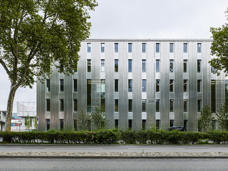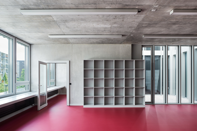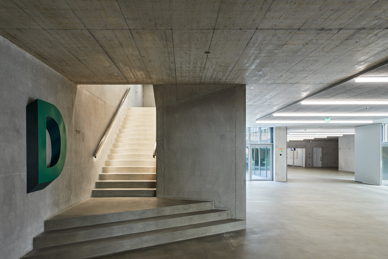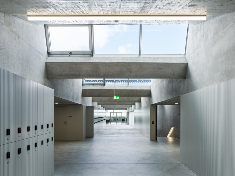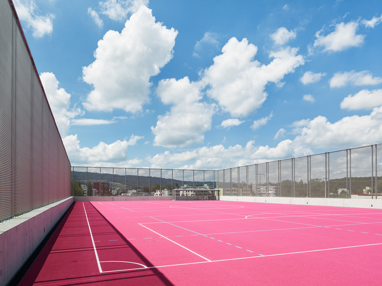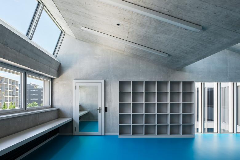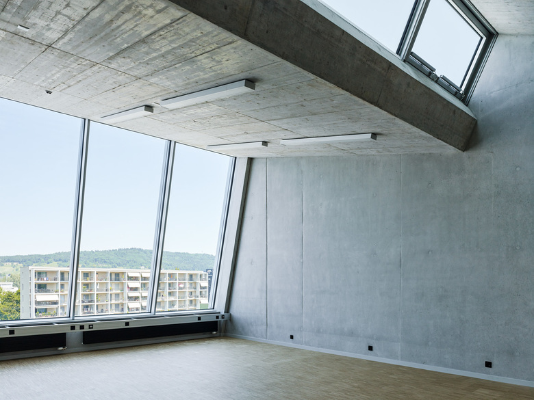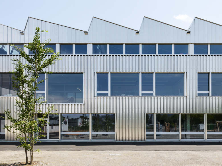 Entsprechend dem Genius Loci prägen ,edelrohe‘ Bauten in differenziertem Kleid und ein Sheddach von ikonografischer Kraft den neuen Schulstandort / Der Hauptteil des Raumprogrammes wird in einem 3-geschossigen Gebäude organisiert. Erdgeschossig liegen Horte, Kindergarten und Bibliothek um ein in der Länge durchgeschobenes Foyer gruppiert. Darüber sind die Klassenräume angeordnet / Ein Sportgebäude mit Aula und Dreifachsporthalle schliesst das Schulareal nach Norden hin ab / Dank einem eigenen Eingang können der südliche Trakt wie auch der Shedhallentrakt ausserhalb der Unterrichtszeiten genutzt werden / Vorgeschlagen wird ein robustes Tragwerk, das bauliche Veränderungen zulässt, aber auch unter dem Aspekt der Ökonomie eine einfache und direkte Materialisierung aufweist.