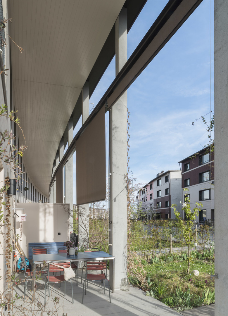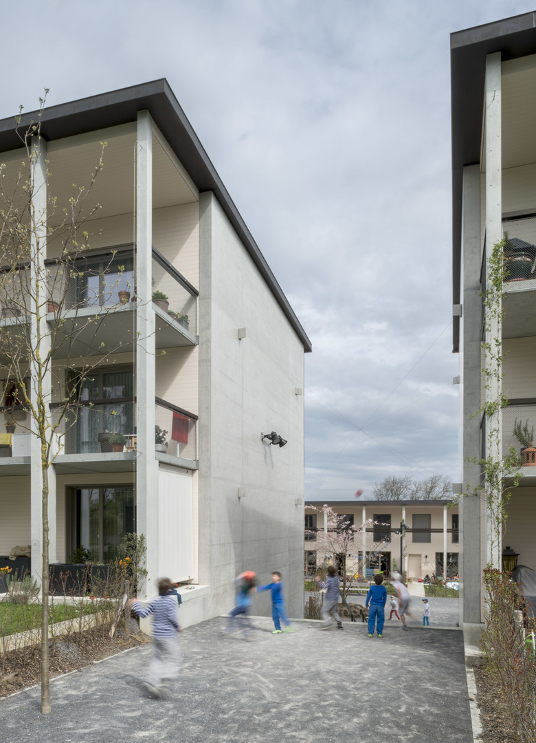 Vier parallel zum Hang verlaufende Bauzeilen bilden Freiräume mit dazwischen-liegenden nahezu horizontalen Freiräumen / Diese dienen als Erschliessungsbe-reich der Wohneinheiten sowie als halböffentliche und private Grünräume / Der unterschiedlich gekrümmte Verlauf der Gebäudezeilen schafft zwei platzähnliche Situationen mit Aufenthalts- und Spielmöglichkeiten / Durch gezielt angeordnete Unterbrüche innerhalb der Zeilen entsteht eine Vernetzung der einzelnen Sied-lungsräume / Gestaffelte Zeilenenden bewirken eine Reduktion der Baumasse und bilden eine Verzahnung mit dem Landschaftsraum.