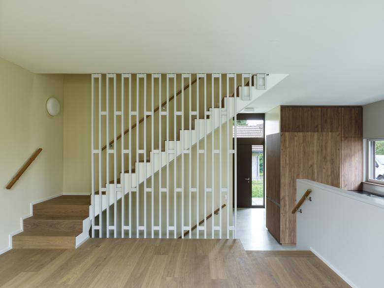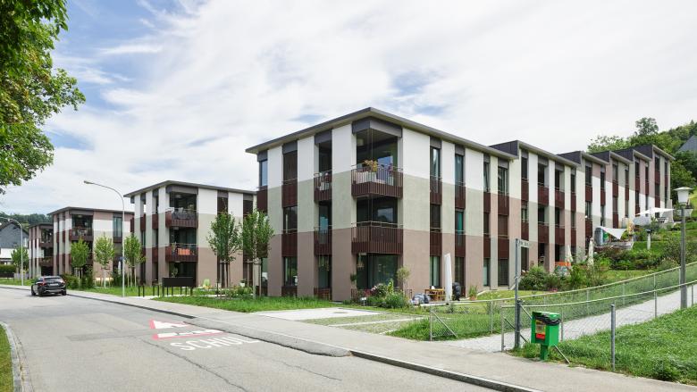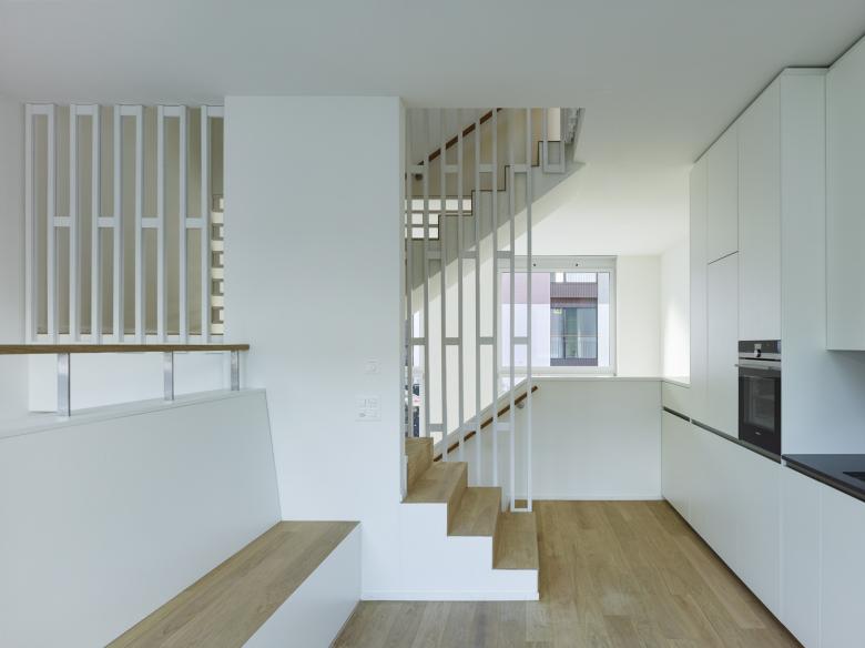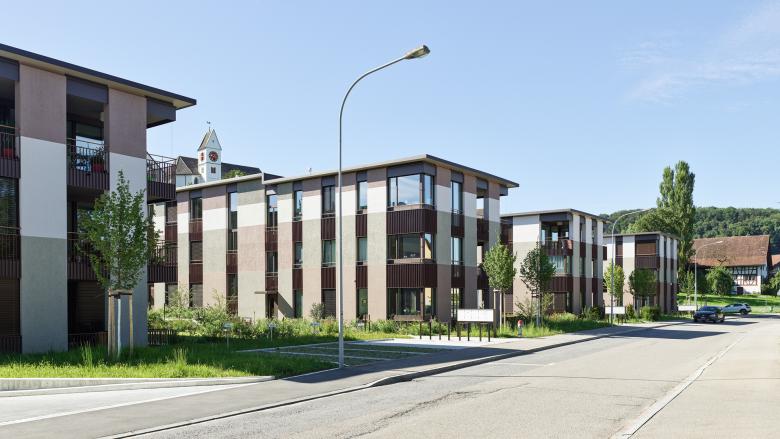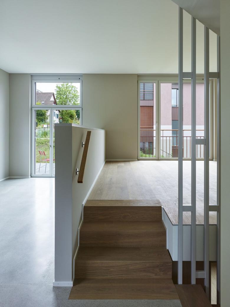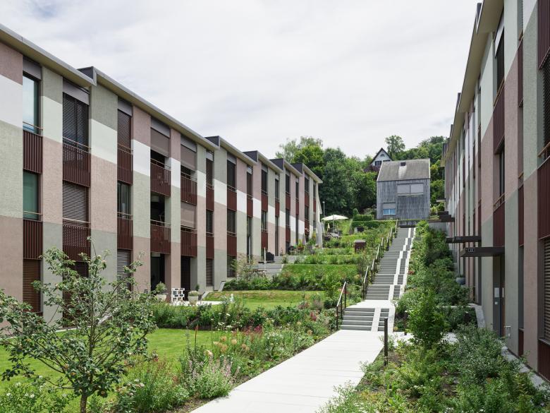 Basierend auf dem Gestaltungsplan von 2001 und in Ergänzung zu den Doppelhäusern, die u.a. von Graber Pulver im oberen Hangbereich realisiert wurden, erfolgte die Entwicklung der vier unteren Zeilen, die dem Gelände in abgetreppter Form folgen / Für die idyllische Lage direkt am Fuss des Kirchenhangs wurde massgeschneidertes Wohneigentum für die unterschiedlichsten Familienphasen entwickelt / An der Strasse entstanden Geschosswohnungen, hinten am Hang Reihenhäuser von verschiedenem Zuschnitt mit Garten / Architektonisch aufgeladen sind die Einheiten mit überhohen Räumen, Splitlevel-Schnitten und wechselnden Treppenläufen.