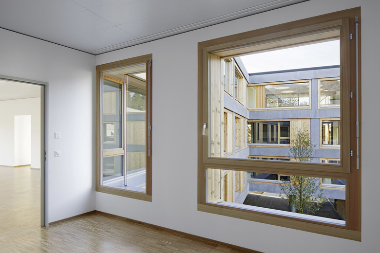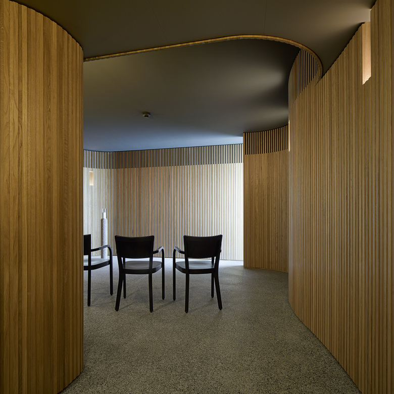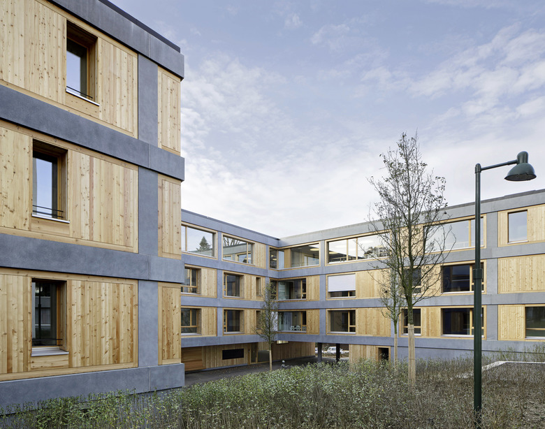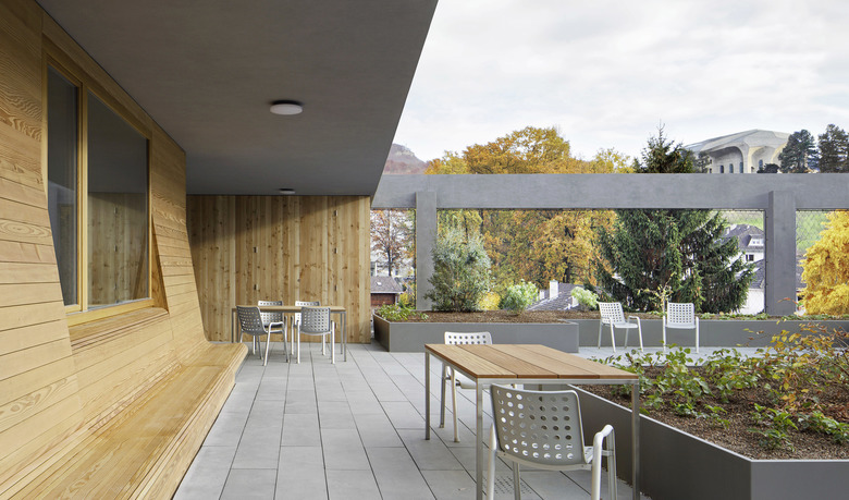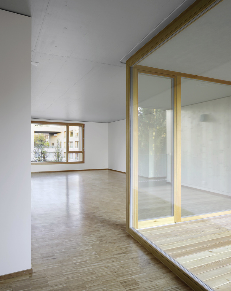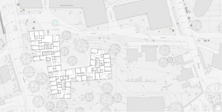 Das vom Gelände und den bestehenden Gebäuden mitgeformte Neubauvolumen vermittelt zwischen dem sich entlang der Höhenlinie ausstreckenden Volumen der Alterswohnungen und den auf unterschiedlichen Niveaus stehenden Einzelvolumen des privaten Wohnens. Das gesamte Raumprogramm (Demenzabteilung und Familienwohnungen) wird in einem Gebäudekörper zusammengefasst. Dies ermöglicht den Bereich für die leichte bis mittelschwere Demenz als autonome, kleine, allseitig orientierte Welt auf dem obersten Geschoss mit angegliedertem Demenzdachgarten zu organisieren. Die rundlaufbildende Raumfigur des Erschliessungs- und Aufenthaltsbereiches folgt dem Bewegungsdrang der Bewohner.