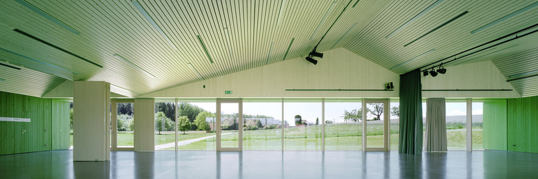 Die neue Mehrzweckhalle welche als Schulaula, Abdankungshalle sowie als Gefäss für das Vereinsleben gebaut wurde, bildet am Rande des Dorfes den städtebaulichen Schlussstein der Siedlung auf dem Weg zum gefassten Friedhofsareal.