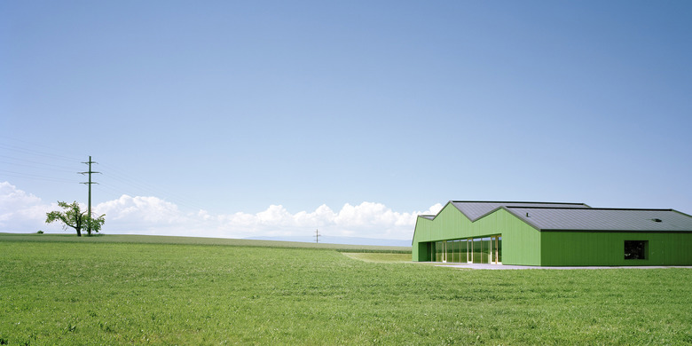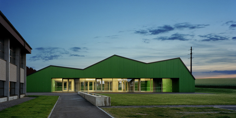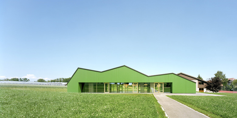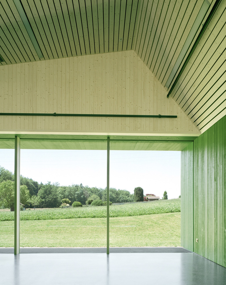 Typologisch angelehnt an die ortsprägenden Gewächshäuser übernimmt der neue Baukörper ortstypische Elemente und deutet sie zu einer eigenen formalen Sprache um. Aufgespannt zwischen den beiden Fusspunkten mit den Serviceräumen, wird der grosse Hallenraum Teil des Weges zum Friedhof. Der polyvalent nutz- und erweiterbare Raum ist mittels Trennwänden und Vorhängen unterteilbar. Je nach Raumaufteilung entstehen durch die gefaltete Decke angemessene differenzierte Raumatmosphären, die einen Rahmen für die unter schiedlichen Bespielungen bilden, von Schulaufführungen bis zu Abdankungsgottesdiensten. Das Raumkonzept des aufspannten grossen gedeckten Raumes mit fliessendem Bezug zum angrenzenden offenen Landschaftsraum findet konstruktiv in der brückenförmigen Tragstruktur aus Fachwerkträger in Holz ihre konstruktive Entsprechung. Das Konstruktionsmaterial Holz prägt auch die äussere Erscheinung des Gebäudes und nimmt Bezug auf traditionelle Oekonomiegebäude im Seeland. Die Fassaden erhalten eine sägerohe grünpigmentierte satt gestossene Tannenschalung, welche je nach Distanz des Betrachters ein Changieren zwischen abstrakter Körperlichkeit und habtischer Materialität erzeugt. Das Bekleiden mit Holz wird im Gebäudeinnern als Futteral im Saalbereich weitergeführt.