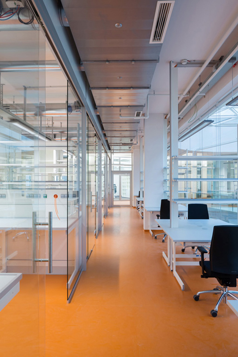 Das räumliche Konzept wurde aus den besonderen funktionalen und organisatorischen Anforderungen der integrativen Labor/Bürocluster der einzelnen Abteilungen und deren Verknüpfung untereinander entwickelt:
