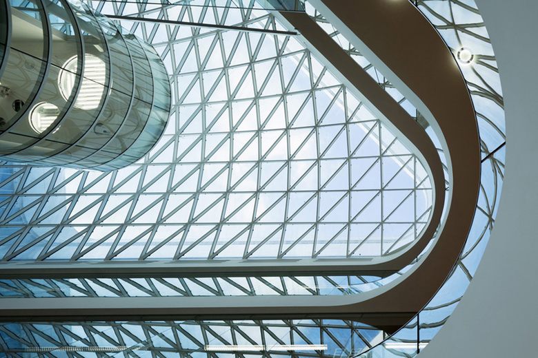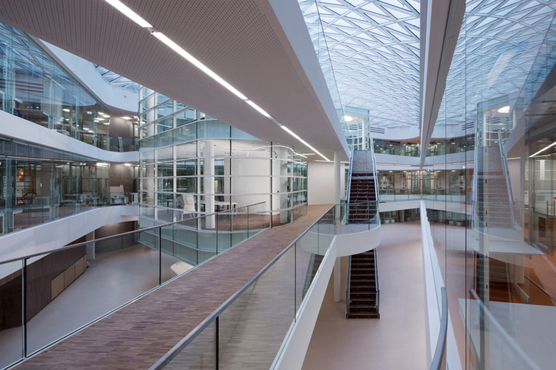 Das Atrium als kommunikatives Zentrum erhält auf halber Höhe über seine gesamte Grundfläche ein trianguläres Oberlicht, das Glasdach ist biaxial gekrümmt und als Gitterschale konstruiert.