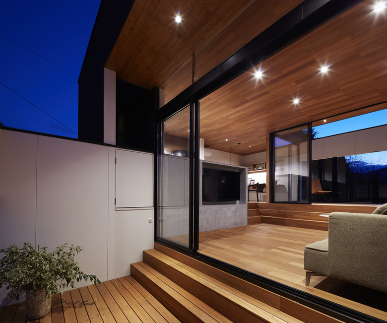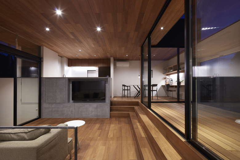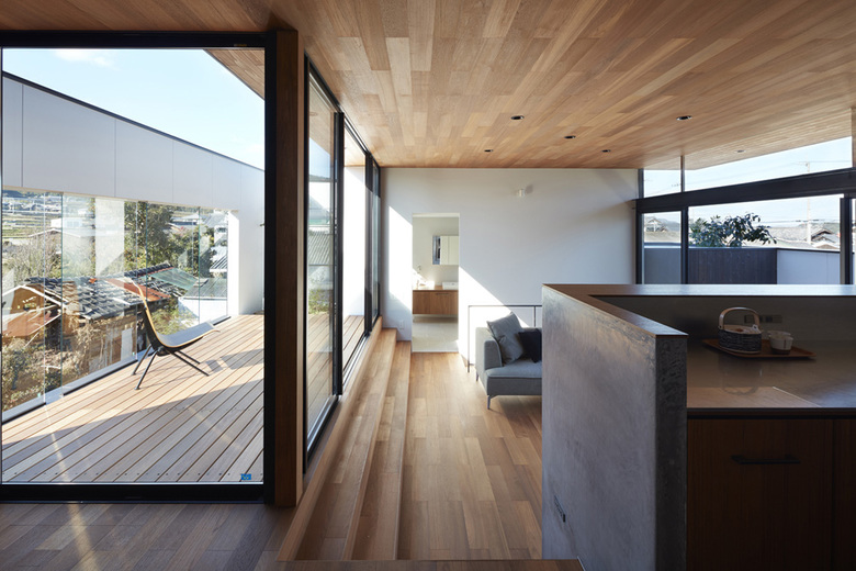 The first floor is lined with bedrooms, children's rooms, and other private rooms, and the second floor has balconies on the east and west sides, flanking the living room. The balcony on the west side, which offers a good view, is raised half a story, while the balcony on the east side, where the family home is located, is lowered half a story. The west balcony is placed at the same floor level as the dining room and kitchen, allowing for a gradual division of the space and the enjoyment of different views depending on the location. The other balcony on the east side is directly connected to the ground level, and a separate Japanese-style room accessed from the balcony is located in the middle of the balcony. In addition, a glass wall on the east balcony can be removed in the future to connect to the rooftop of the office building to be constructed. By skipping up and down the balcony, we feel that a beautiful distant landscape can be taken in and various activities can be conducted across the ground level.