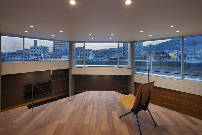 The road on the west side of the river is about 1m higher than the site, so when the main living space is on the first floor and openings are set up, the view from the road is all that one is concerned about, and the mountains in the distance cannot be seen. The first floor is protected from the surrounding environment by narrowing the openings and opening to the sky through the atrium. The atrium serves as a boundary to the exterior. The atrium serves as a boundary with the exterior, and the space and landscape seen from the second living room, bedrooms, and children's room are gently connected through the boundary. The exterior wall on the west side is bent into a fan shape, allowing a panoramic view of the landscape extending from the river to the mountains to be taken in. The wall columns at the points of inflection bear the horizontal forces, and a large opening is realized despite the wooden construction.