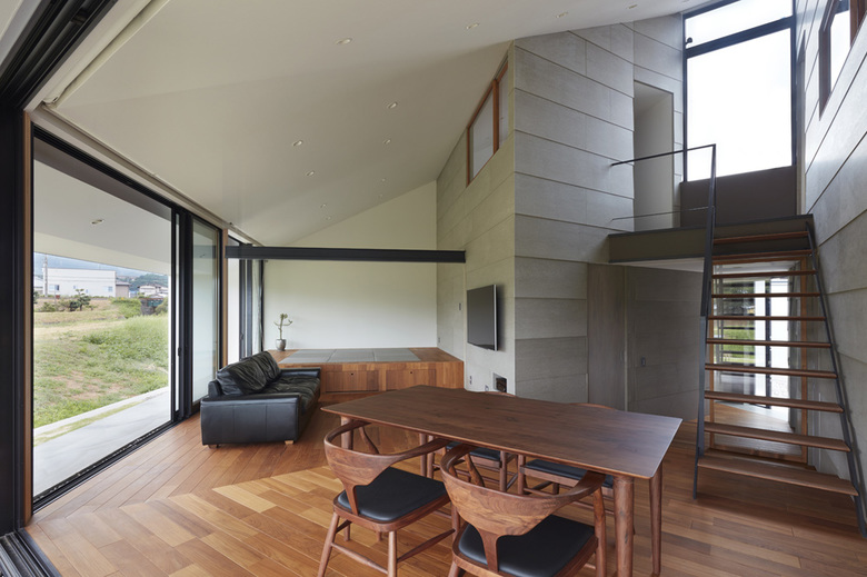 First, in consideration of the environment where wind passes from east to west, a blank space was left on the west side of the site, and the building was placed on the east side. The building was then divided into two parts and opened up in a fan shape to maximize the view. The east exterior wall extends to the ground in line with the slope of the roof, and not only functions as a fence to gently block the view of the neighboring houses, but also seems to reach out in the direction of the scenic view, gently enveloping the house from a different perspective. In addition, by opening a gap in the fan-shaped form, a valley is created that serves as a ventilation channel, allowing cool breezes from the river to pass through the living rooms. The entranceway opens through the approach on the west side, revealing a valley with light streaming in from the back, through which a panoramic view spreads out, creating a story of flow lines. This creates a variety of interior expressions. The terrace with full frontage leading from the LDK is protected by deep eaves and provides a place for various gatherings.