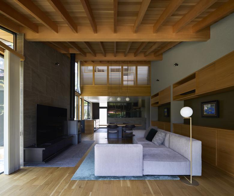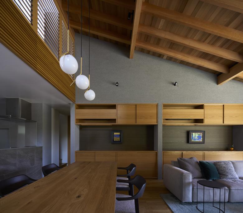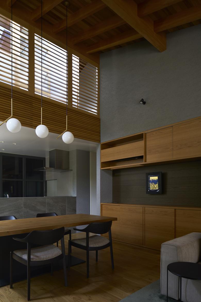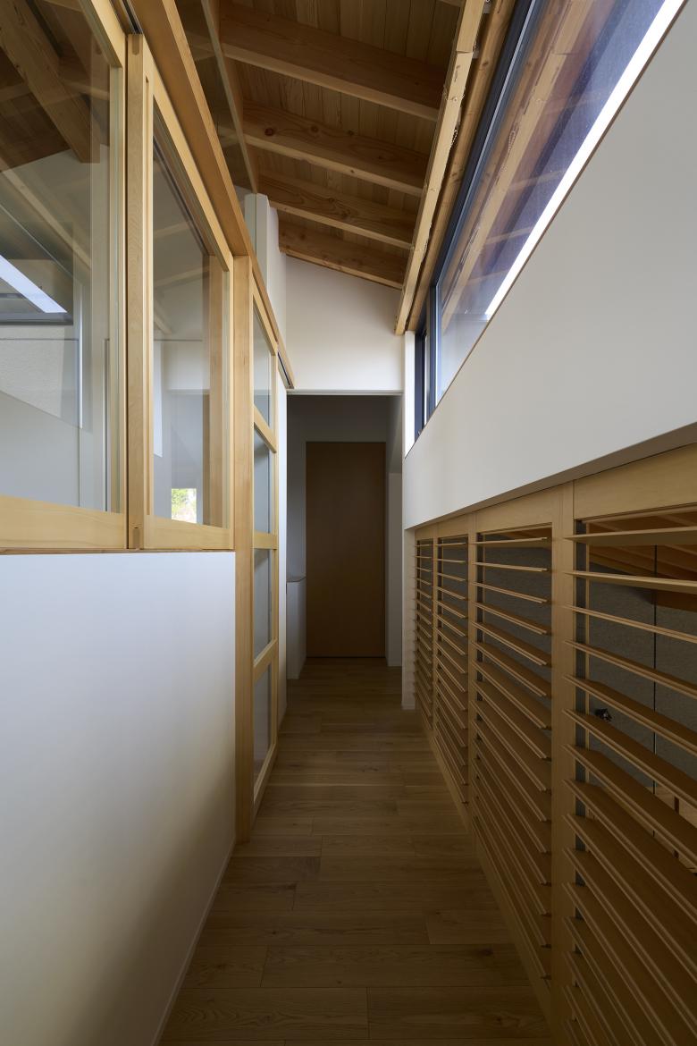 Based on the open plan to the southwest, we wanted to promote air circulation by allowing the wind coming in from the wet-edge to pass through to the various rooms on the second floor, and also to create an air retention system to accumulate cold and warm air in the main room depending on seasonal changes. First, we eliminated the attic on each floor, and created sloped ceilings in line with the slope of the roof. By installing movable louvers in the gap created by the gap between the sloped ceiling on the first floor and the floor on the second floor, corridor 2 on the second floor becomes an air conditioning room, and when the windows are open, the breeze from the wet edge passes through the louvers due to the temperature difference ventilation. When the louvers are closed, the air volume connection with the second floor can be maintained and the air in the main room can be held in place. The louvers are closed to allow air to stagnate in the main room. Light from the south comes not only from the wet-edge, but also from the courtyard, and direct light from Corridor 2 on the second floor passes through the movable louvers, allowing gentle light to enter. The amount of lighting can be adjusted by opening and closing the louvers as well as the air.