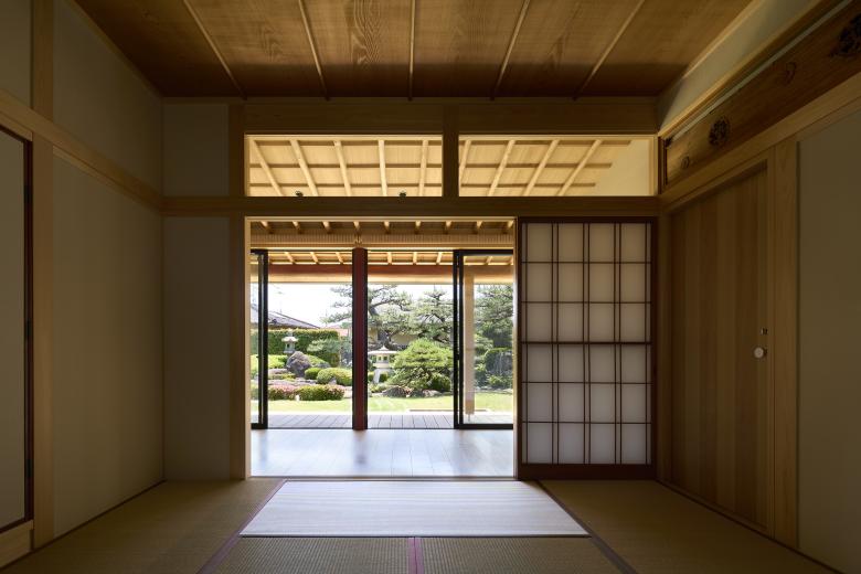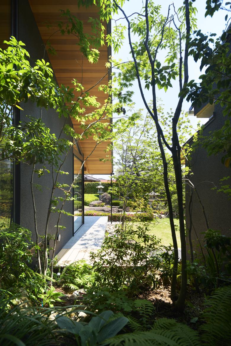 The new building is designed so that all the rooms open to the garden, resulting in a plan that is open to the southwest and symmetrical with the existing building, which opens to the southeast. The two wings are arranged to wrap around the garden from a bird's eye view of the entire site. The two wings of the building are separated from each other by a gap to create a breezeway, and a new element of the garden, a courtyard, is created in this space. The courtyard is connected to the garden by a corridor1 that allows visitors to stroll through the garden. Part of the existing building was renovated as a guest room, and the wet-edge in front of it was connected to the new building, creating an exterior circulation line protected by deep eaves. The owner guides guests along the wet-edge while enjoying the greenery of the garden and courtyard.