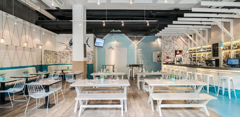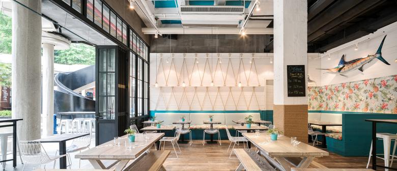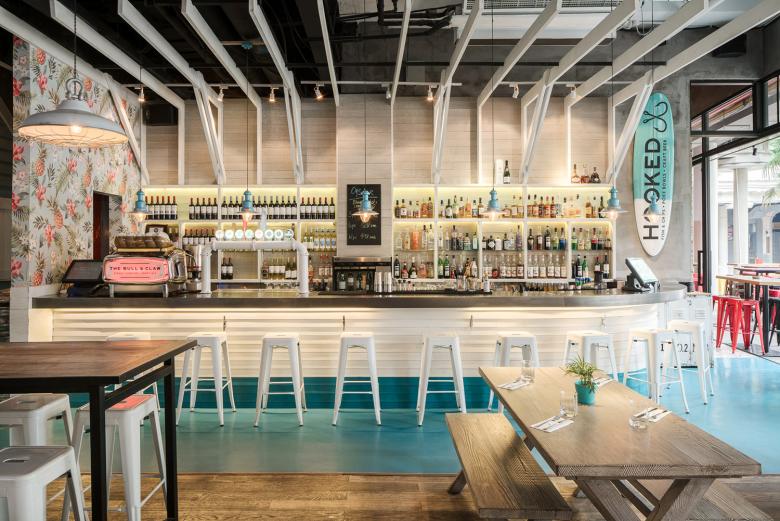 Hooked is a casual fish and chip seafood restaurant and bar in the newly renovated Found 158 complex in Shanghai. The interior is relaxed and playful with fresh white furniture and white washed timber plank finishes. Tropical wallpaper and aqua blue add fun pops of colour throughout the space. The space is accented with some marine-themed elements- boat cleats and rope - with a boathouse row feature wall. The bar references the inside of a boat shed with exposed framing and a weatherboard clad bar front. Hooked is fast becoming the go-to place in Shanghai for a light and fresh free-flow brunch or a relaxing evening cocktail. The playfulness of the space entices a young and crisp crowd