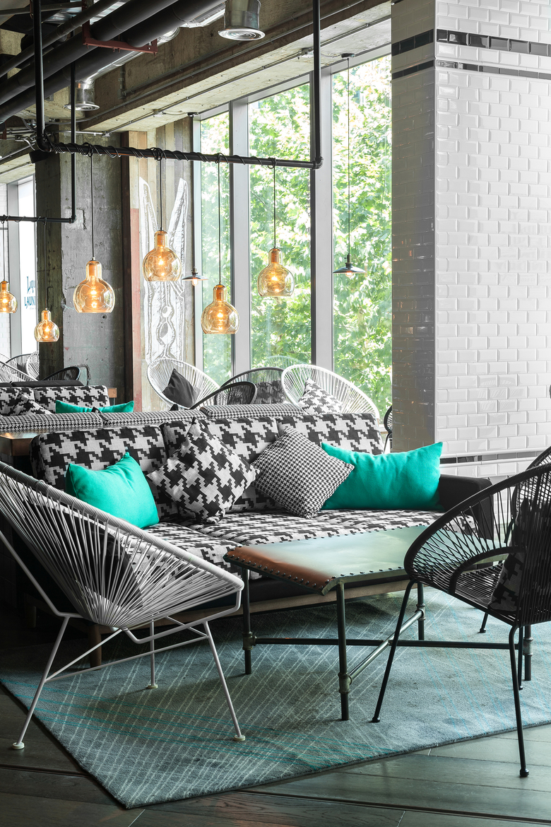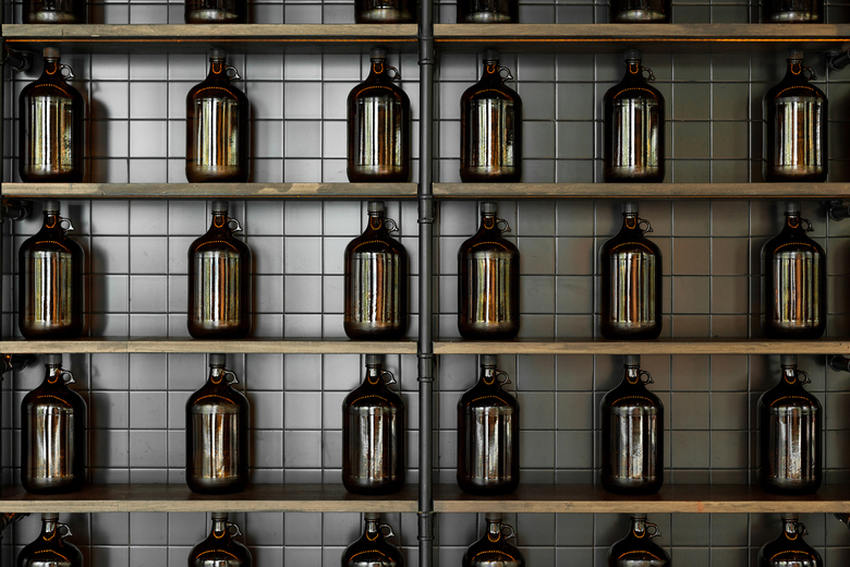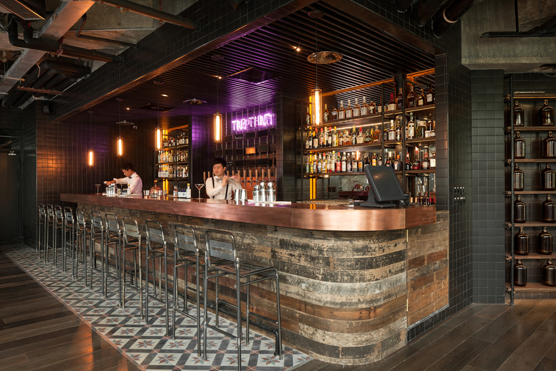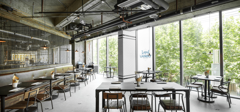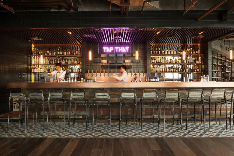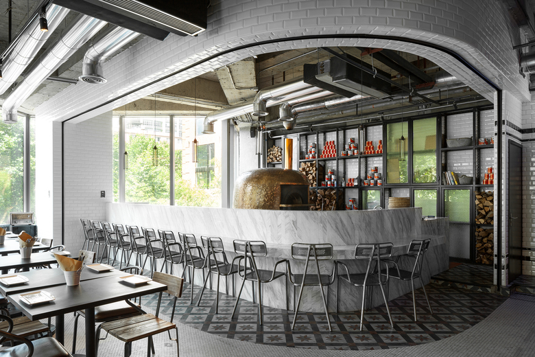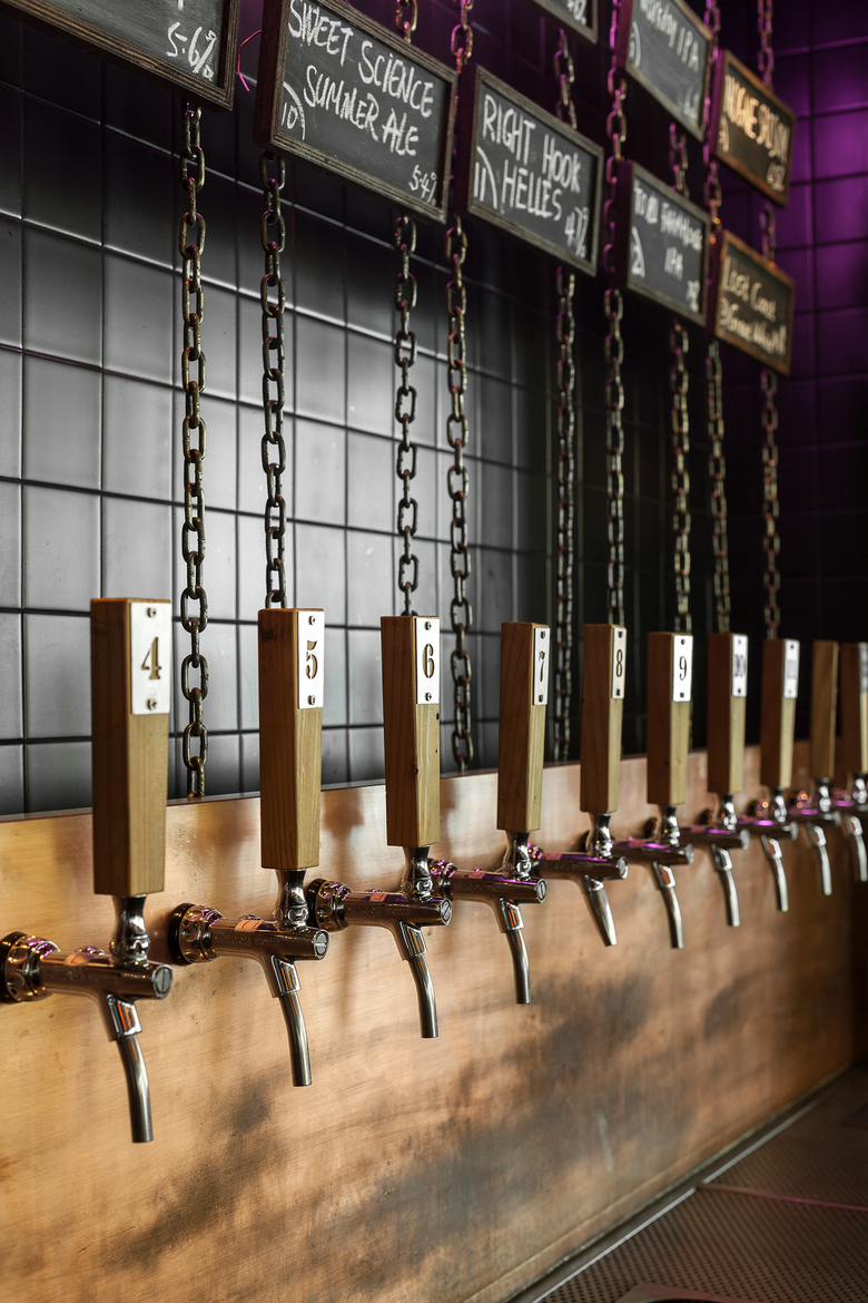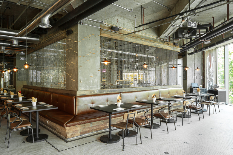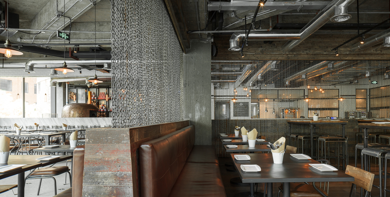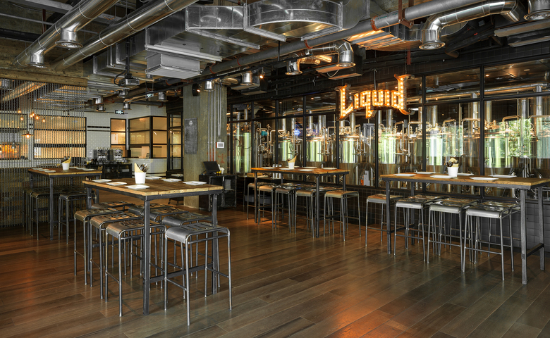 An industrial palette with retro cues creates a casual, urban space. Gleaming stainless steel brew tanks look over the bar area, while a large open kitchen and copper-clad wood fire pizza oven warm up the dinners.